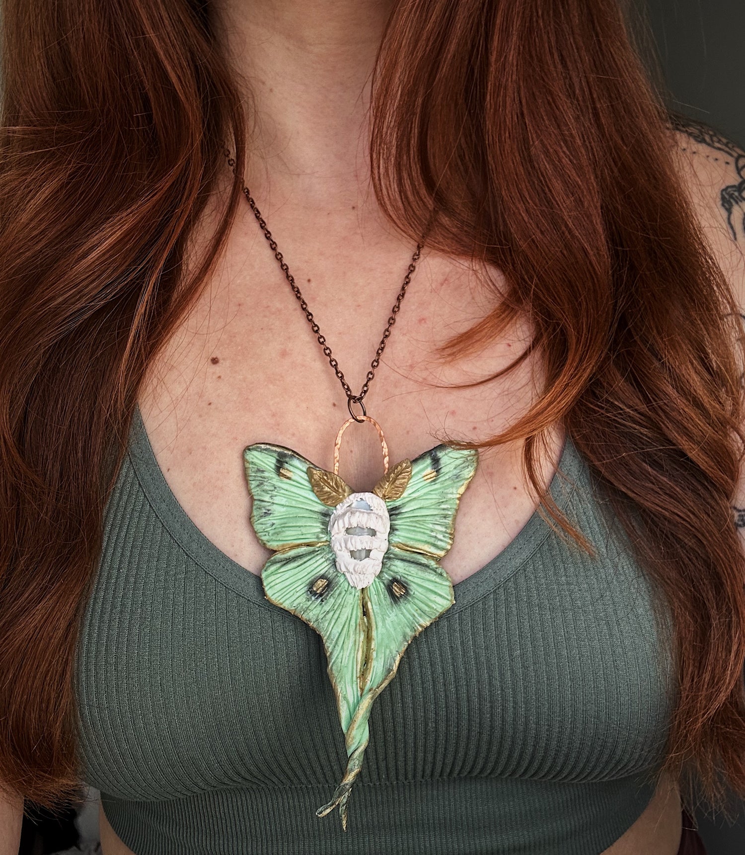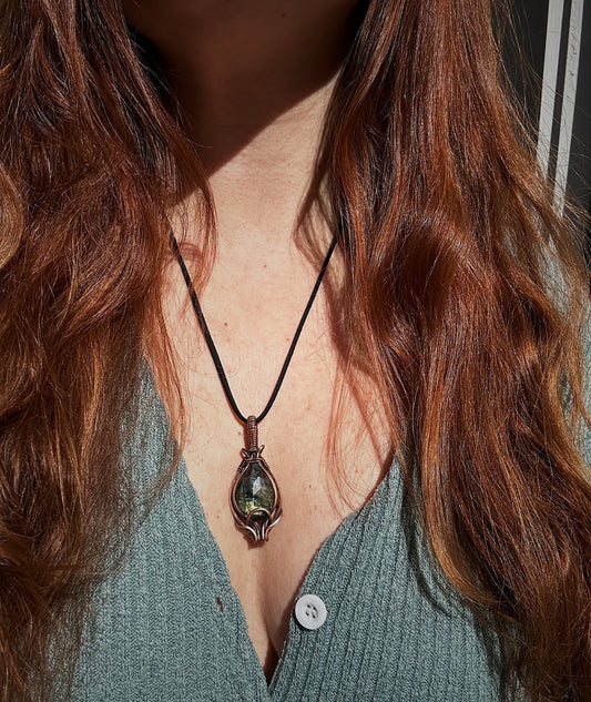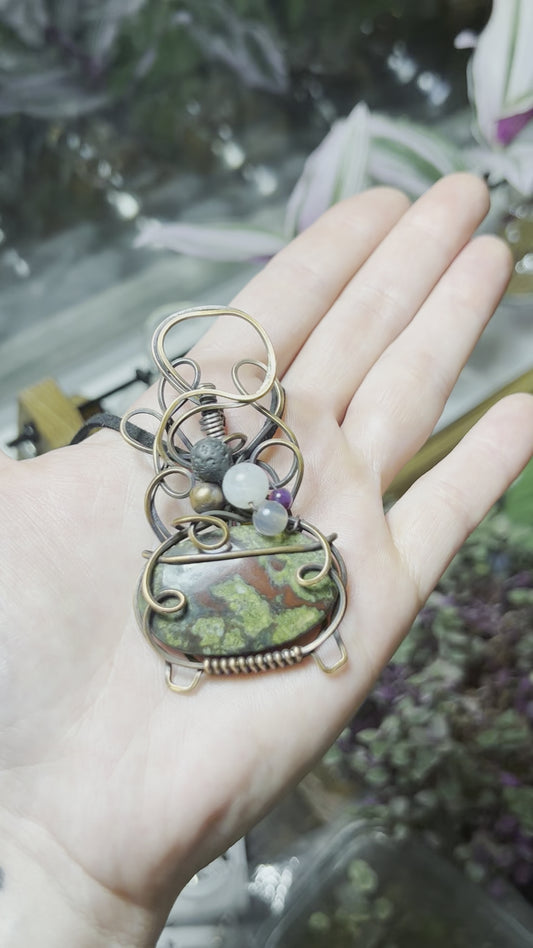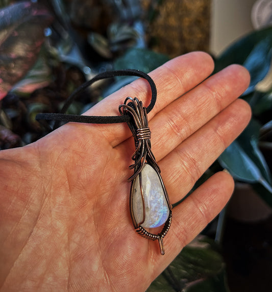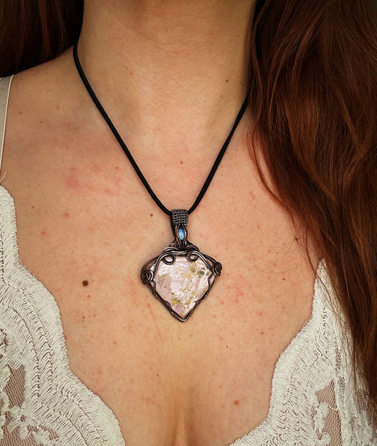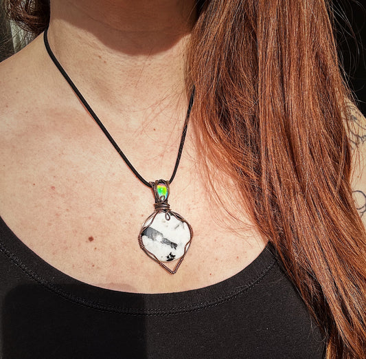 Phosphosiderite stone wrapped in antiqued copper and accented with opal