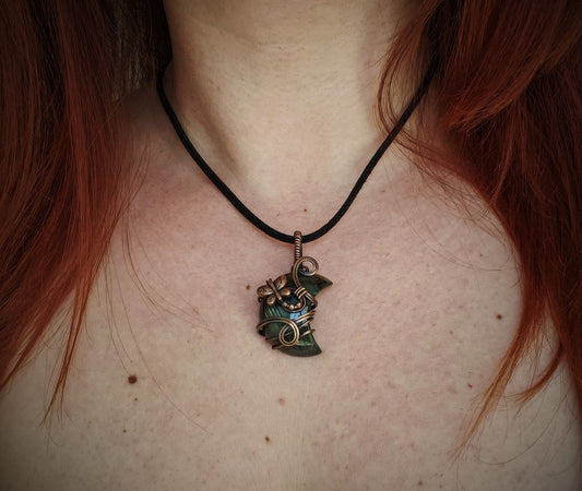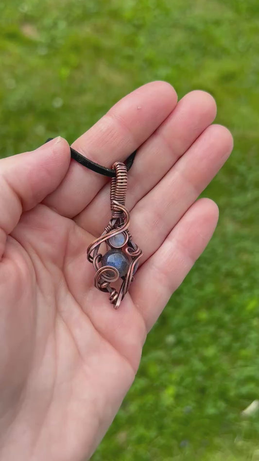 Mood Shaped Labradorite Stone Wrapped in Oxidized Copper with a Copper Butterly Bead