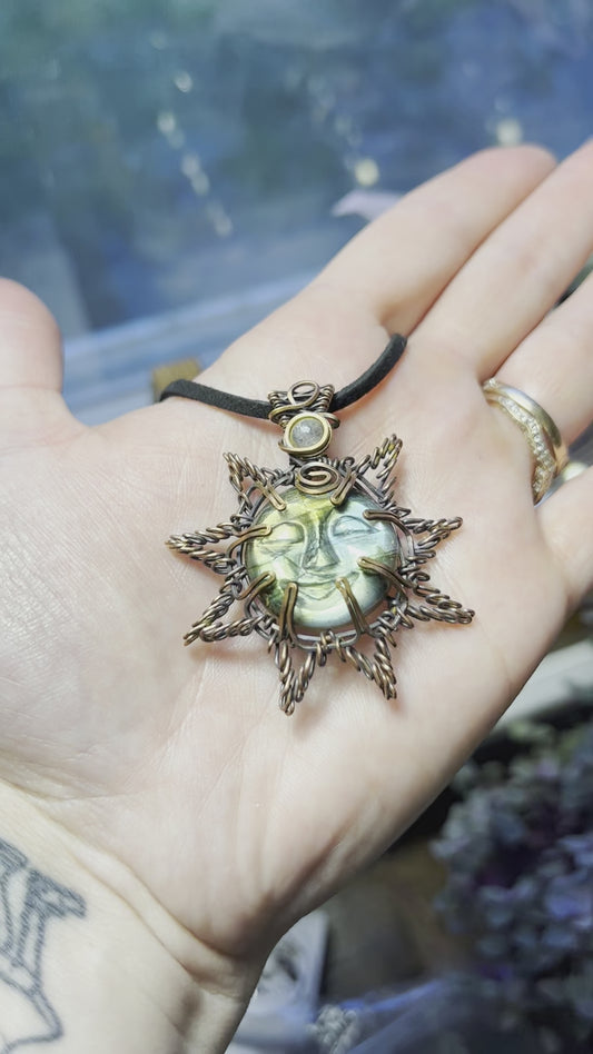 Sun pendant made from a carved labradorite, moonstone accent and oxidized copper