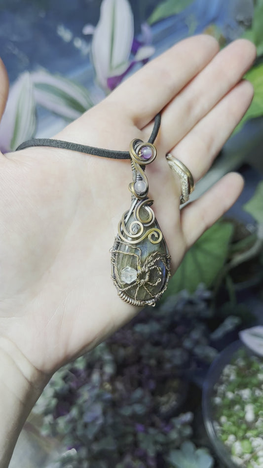 Large Purple Labadorite Pendant Wrapped in Oxidized Copper and Accented with a Moonstone