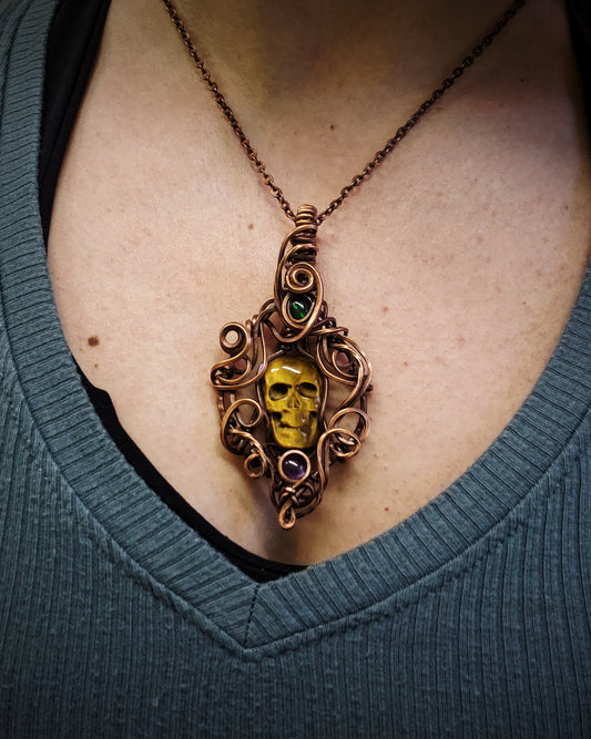 Tigers Eye Skull Stone Oxidized Copper Wire Wrapped Pendant Accented with a Fire Opal and Amythest Stone.