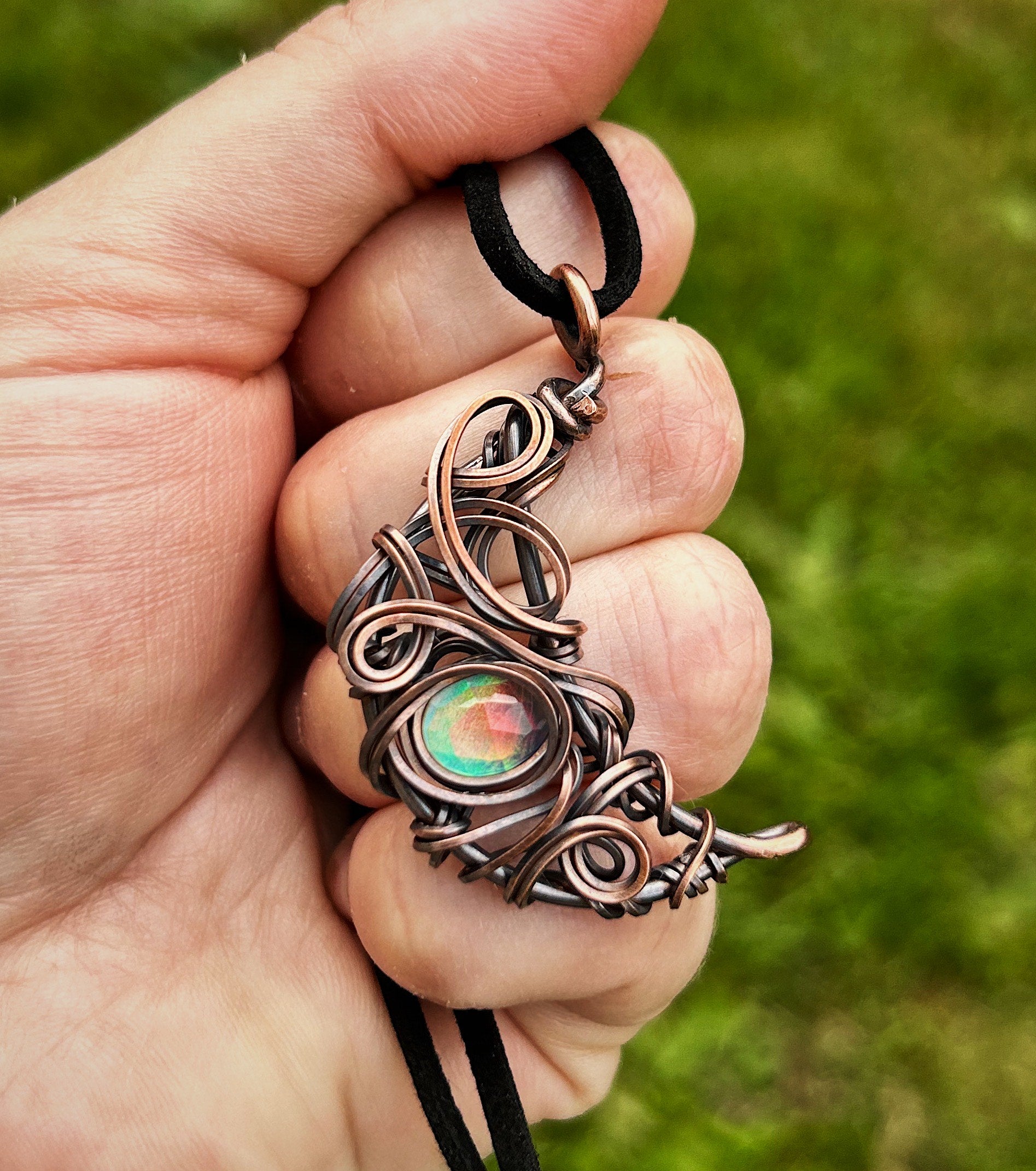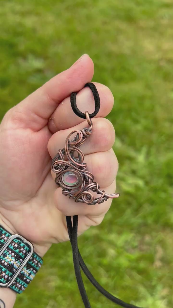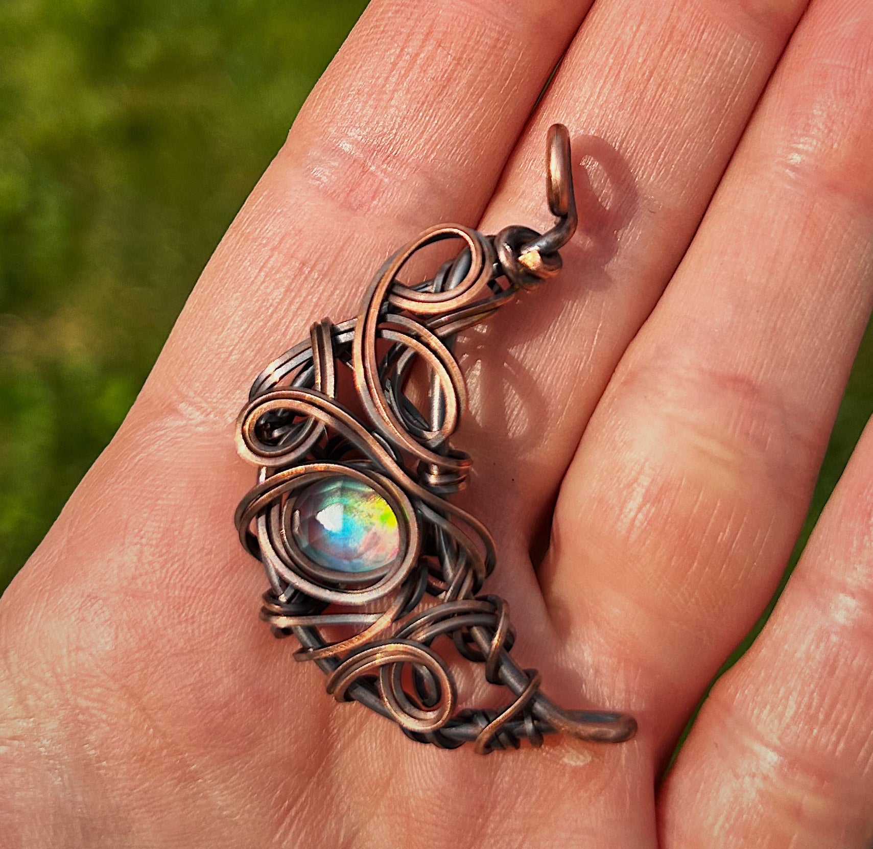 Oxidized copper wire moon pendant with swirl patterns and accent aurora opal stone (man-made).