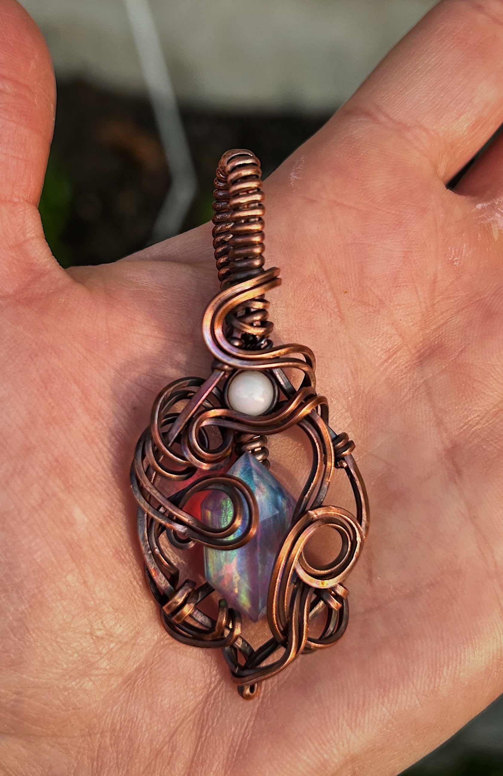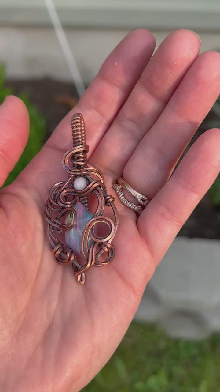 A beautiful aurora opal (man-made) wrapped in oxidized copper wire and accented with pale opal (natural).