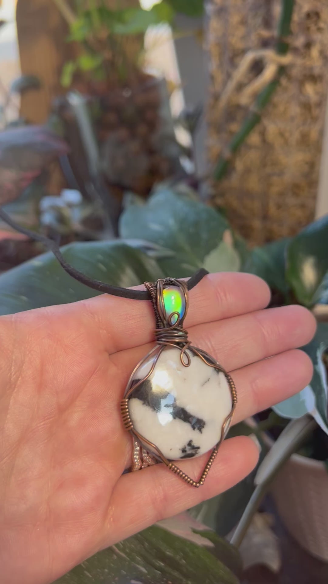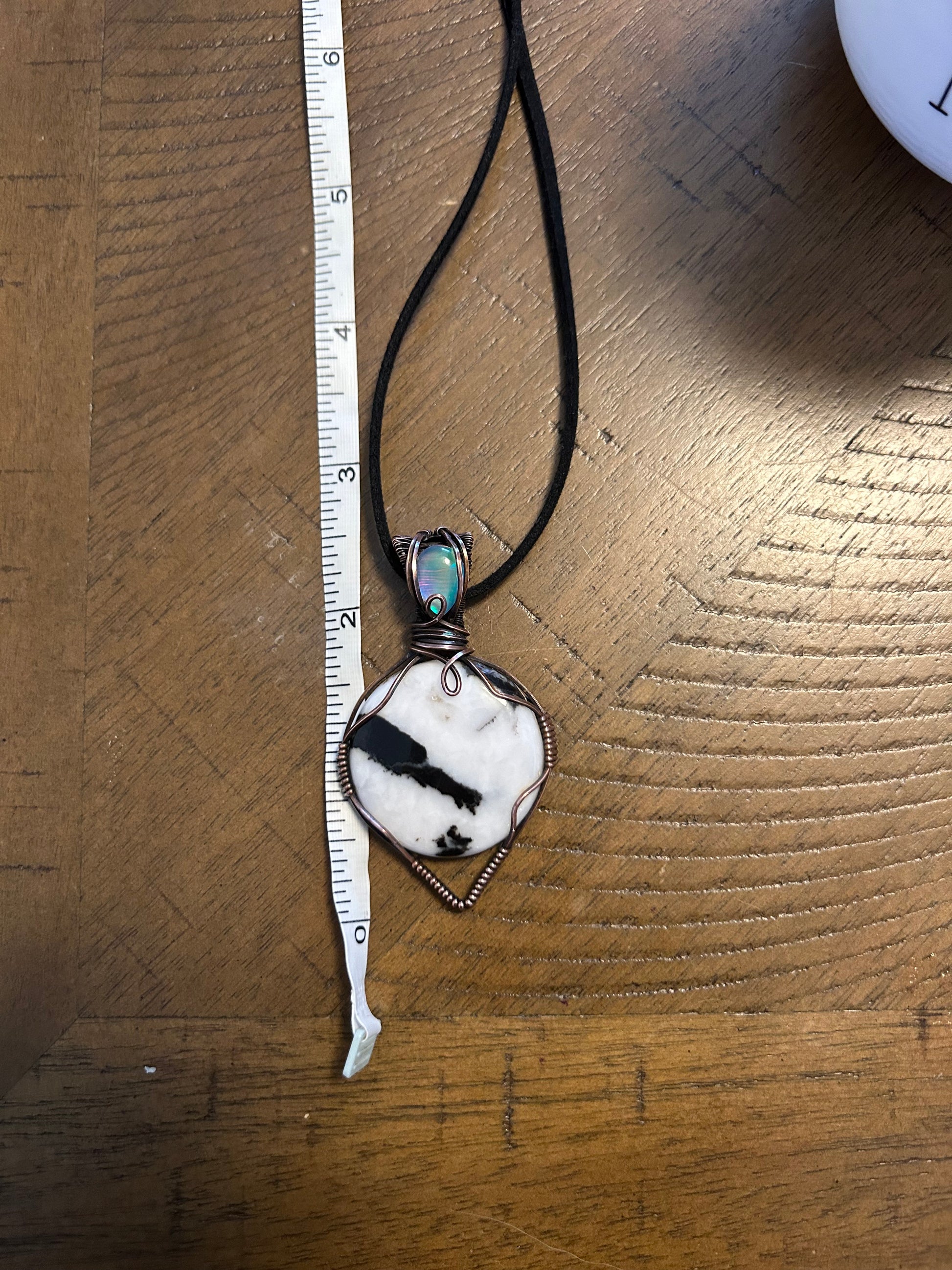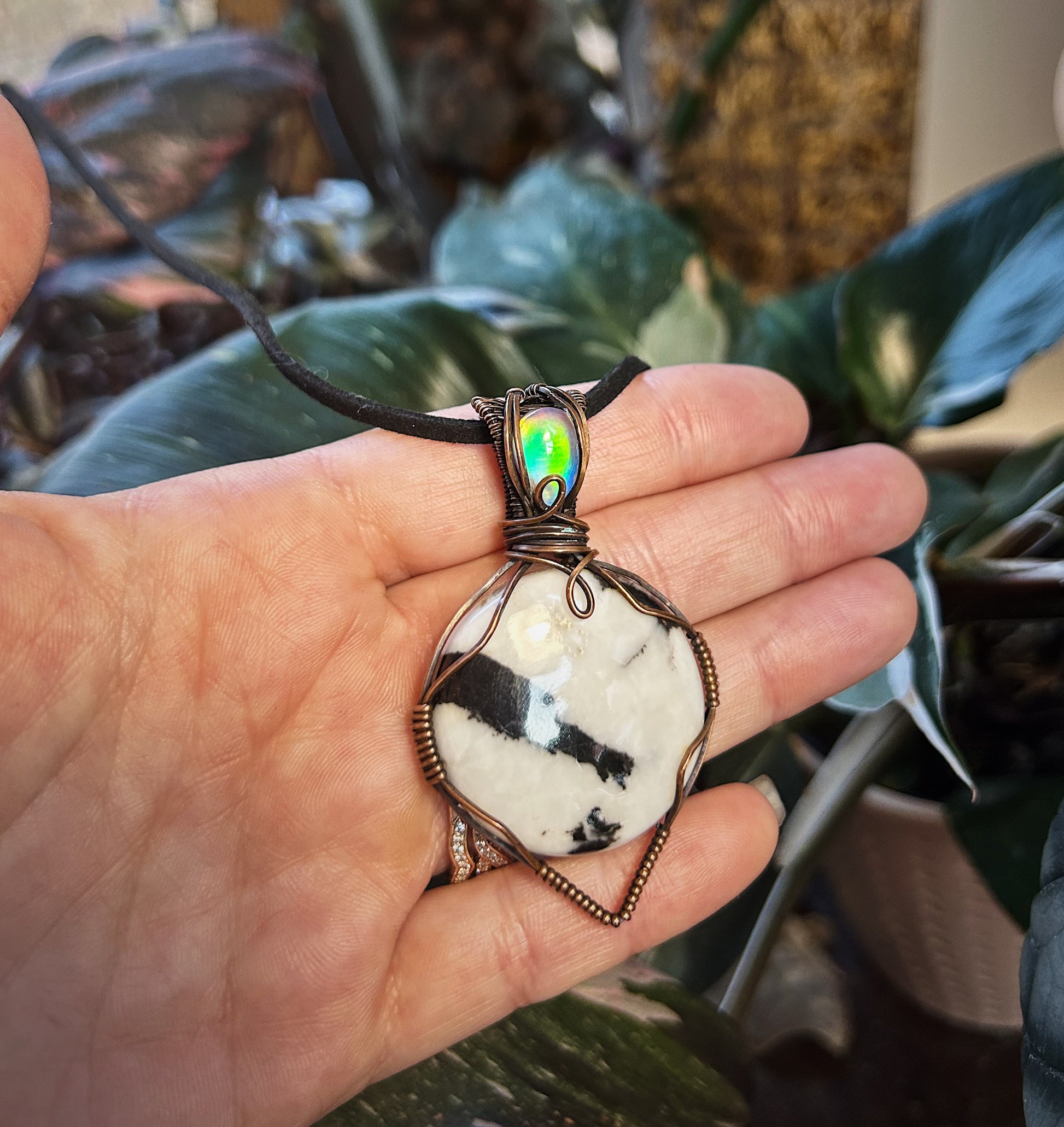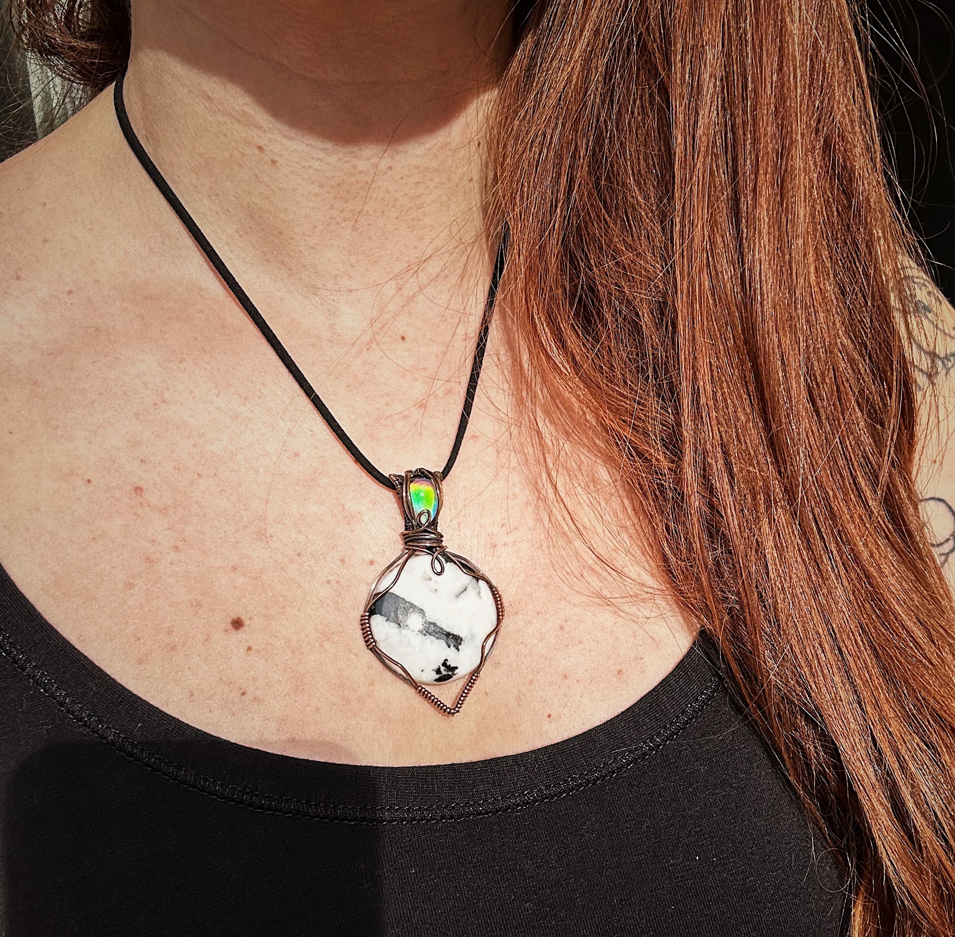 Buffalo jasper and aurora opal hand wrapped in oxidized copper.