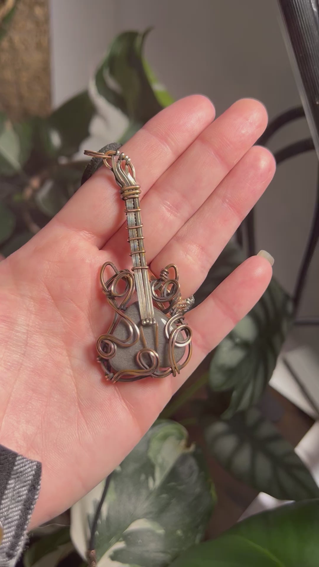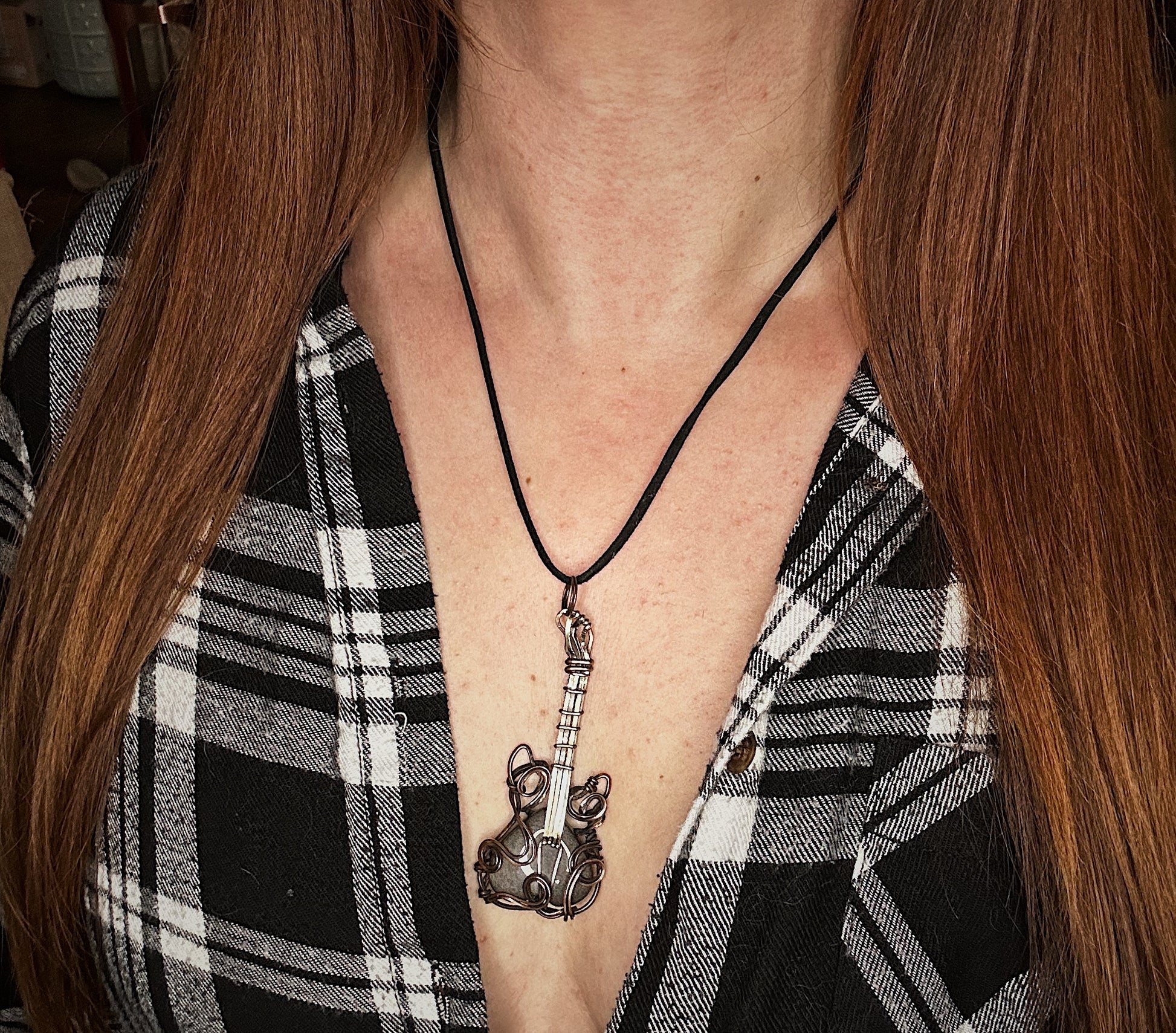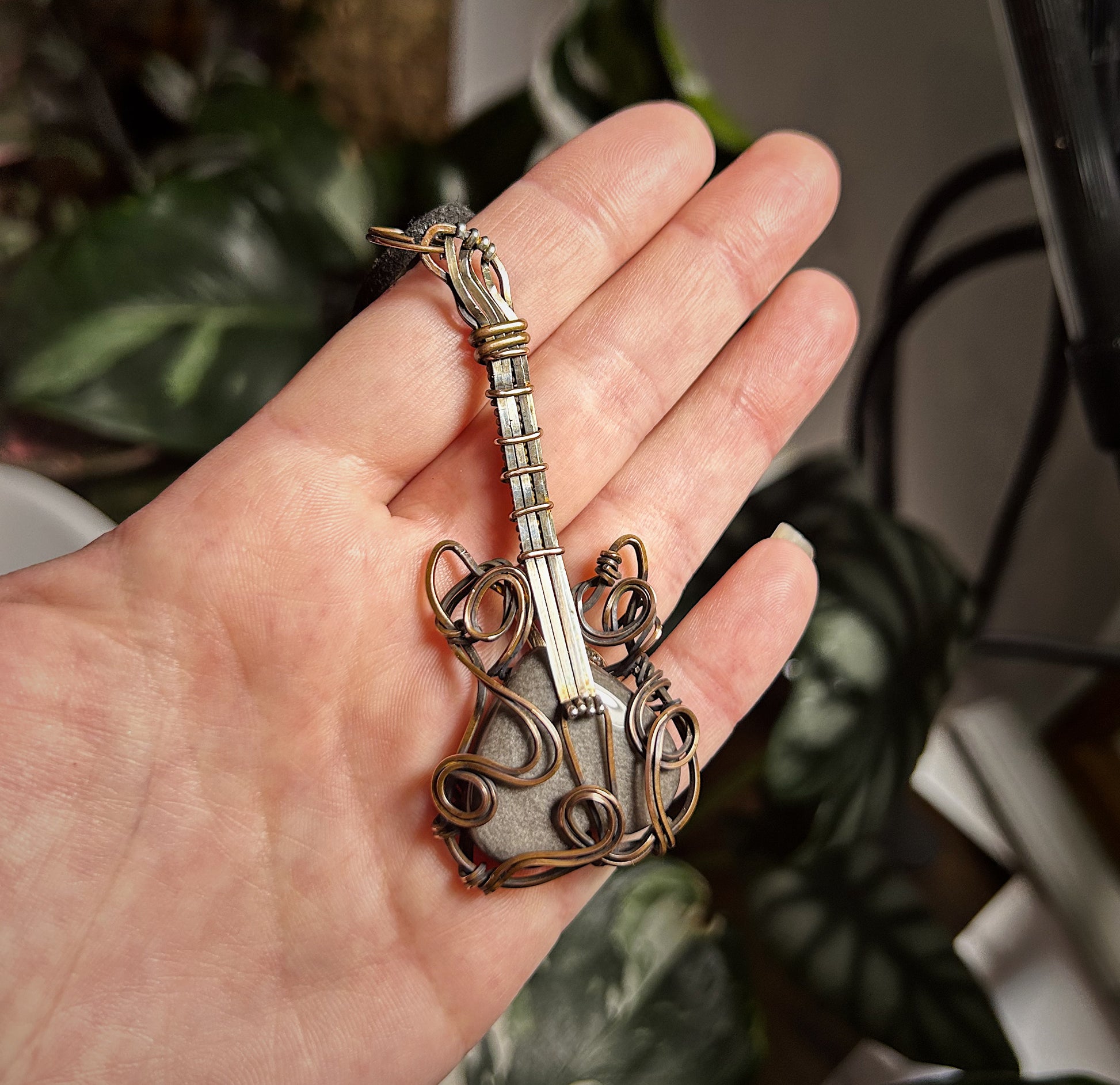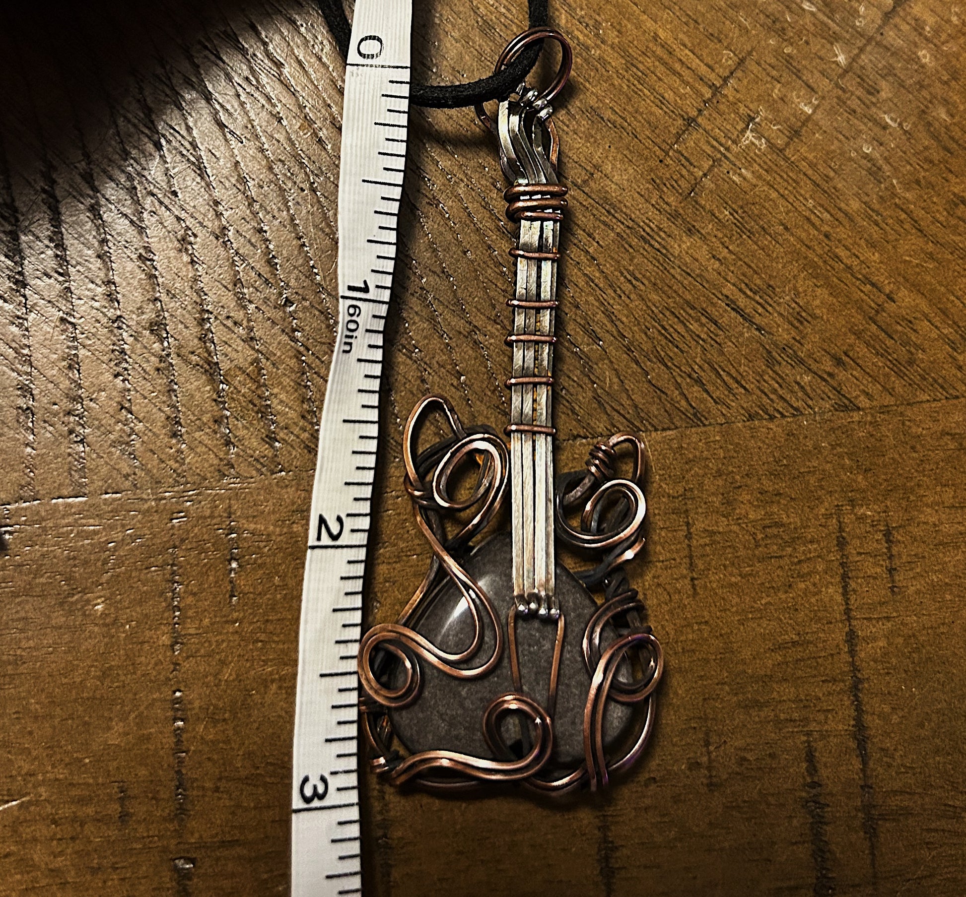 Copper and silver wire guitar over silver obsidian stone