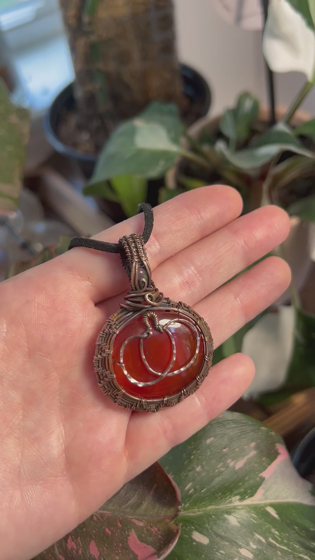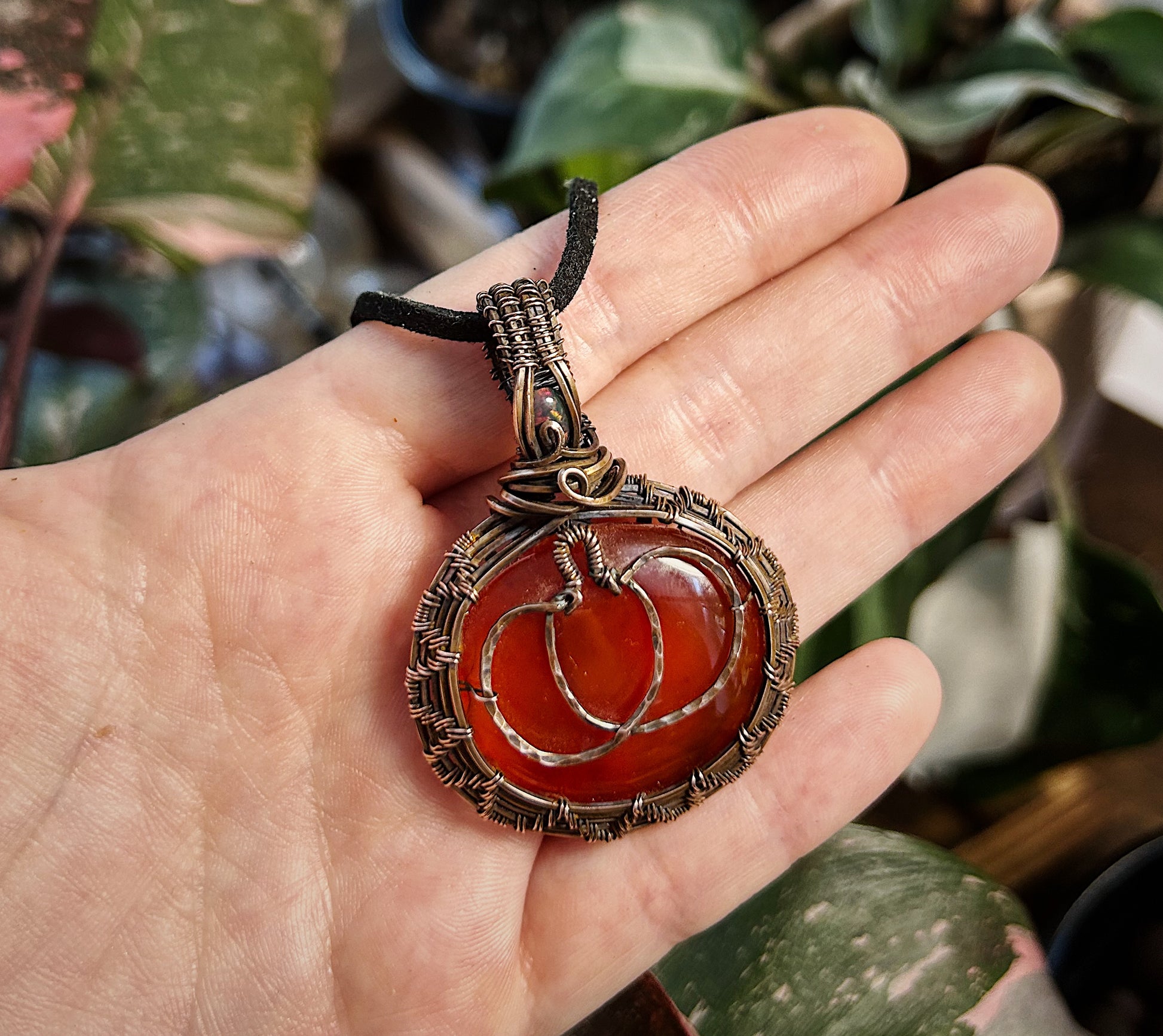 red onyx stone intricately wrapped in copper wire with woven frame, pumpkin shape, and fire opal accent in the bale.