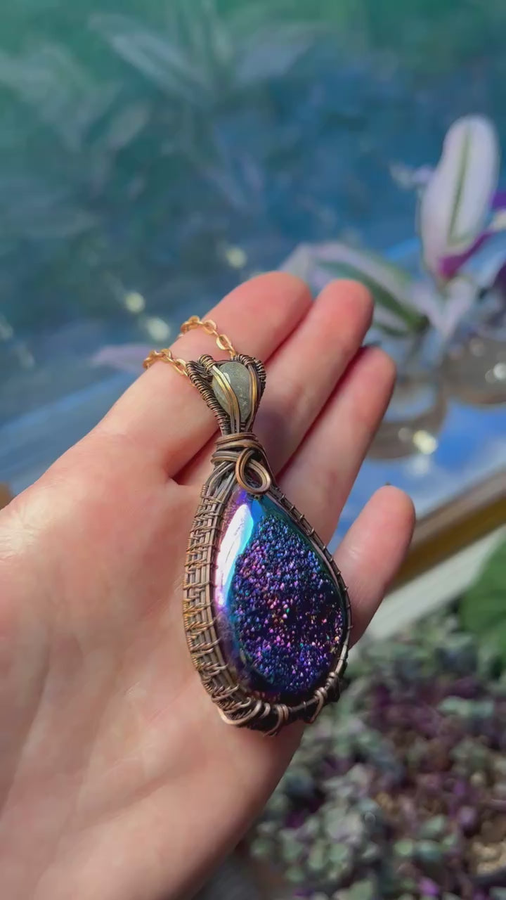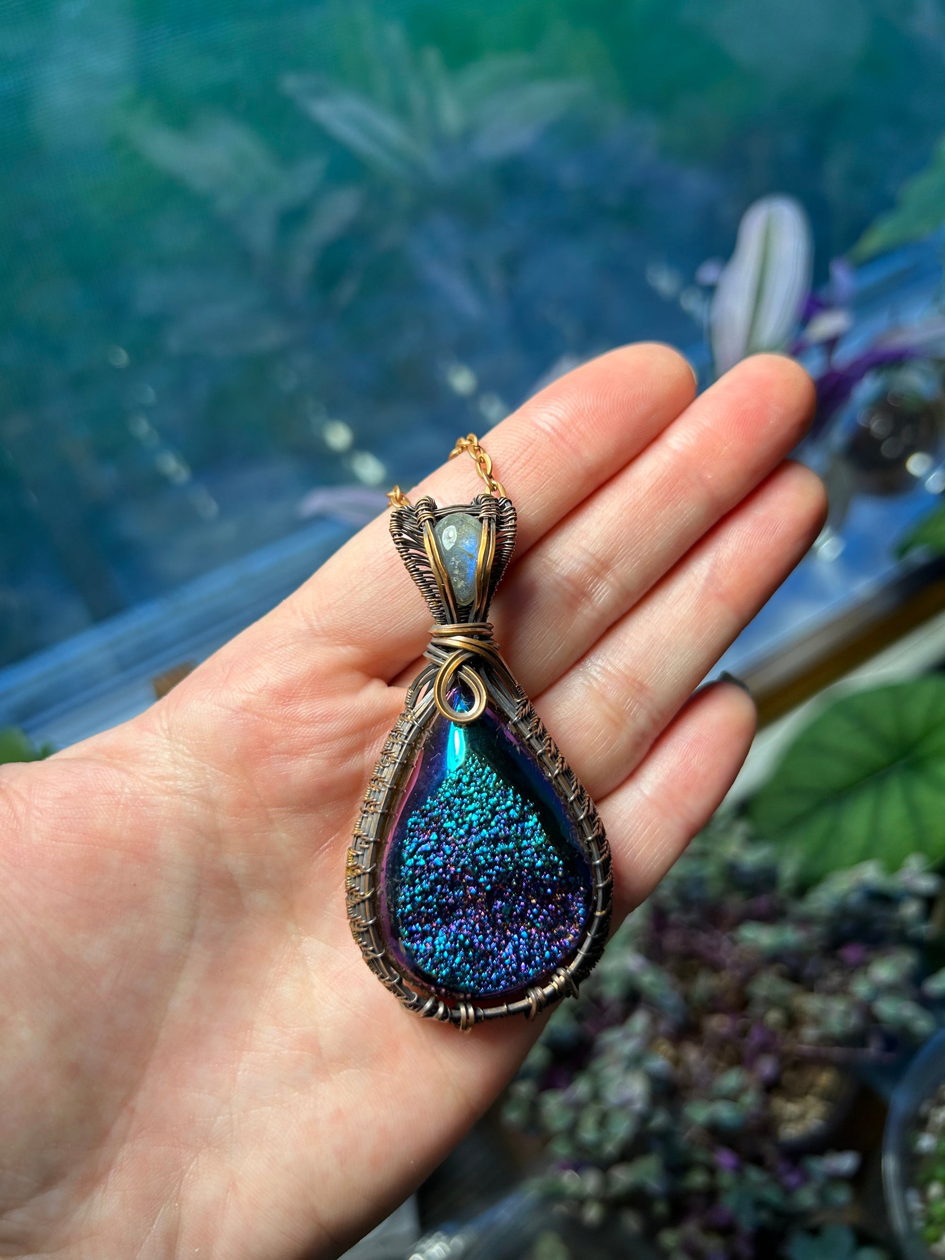 This pendant is wrapped intricately using oxidized copper wire and encasing the most lovely druzy I have ever seen. It is finished off with a labradorite stone accenting the bale.