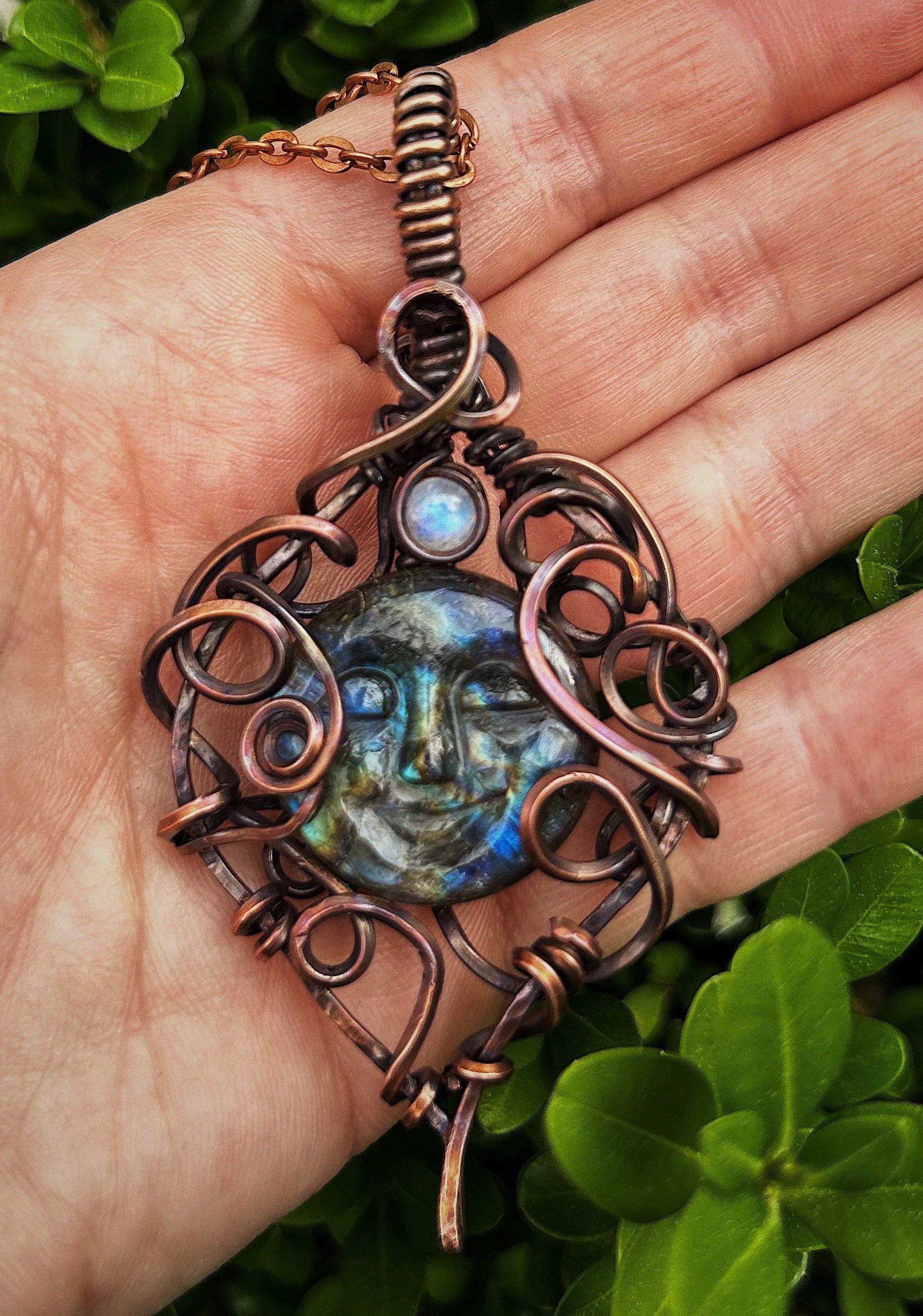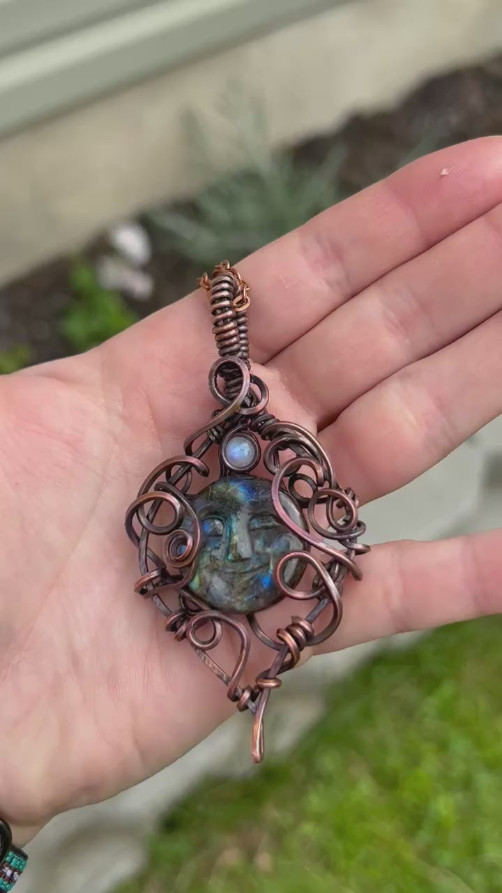 Beautiful and flashy labradorite stone carved into a face and wrapped with oxidized copper wire and accented with a small moonstone at top.