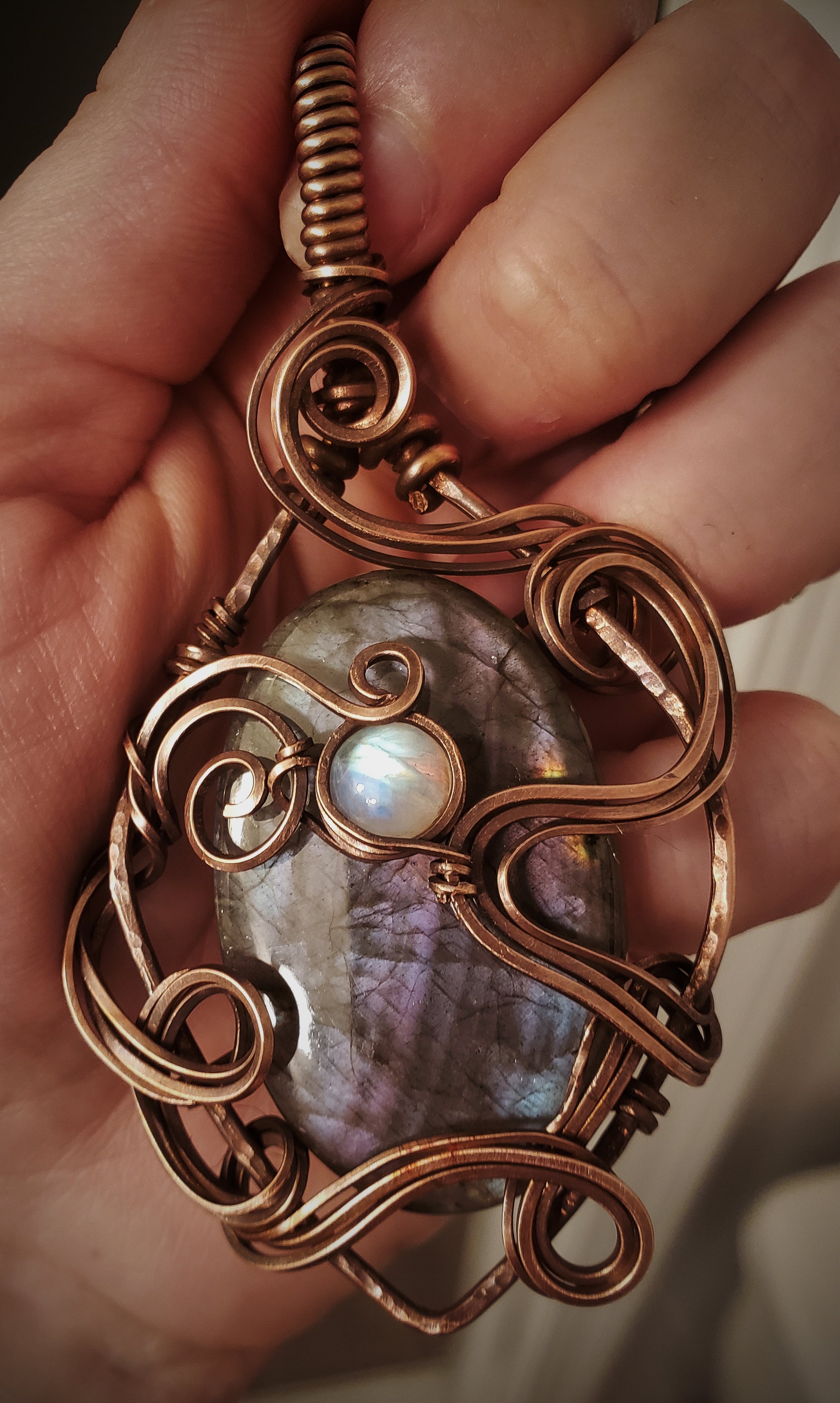 Large Purple Labadorite Pendant Wrapped in Oxidized Copper and Accented with a Moonstone