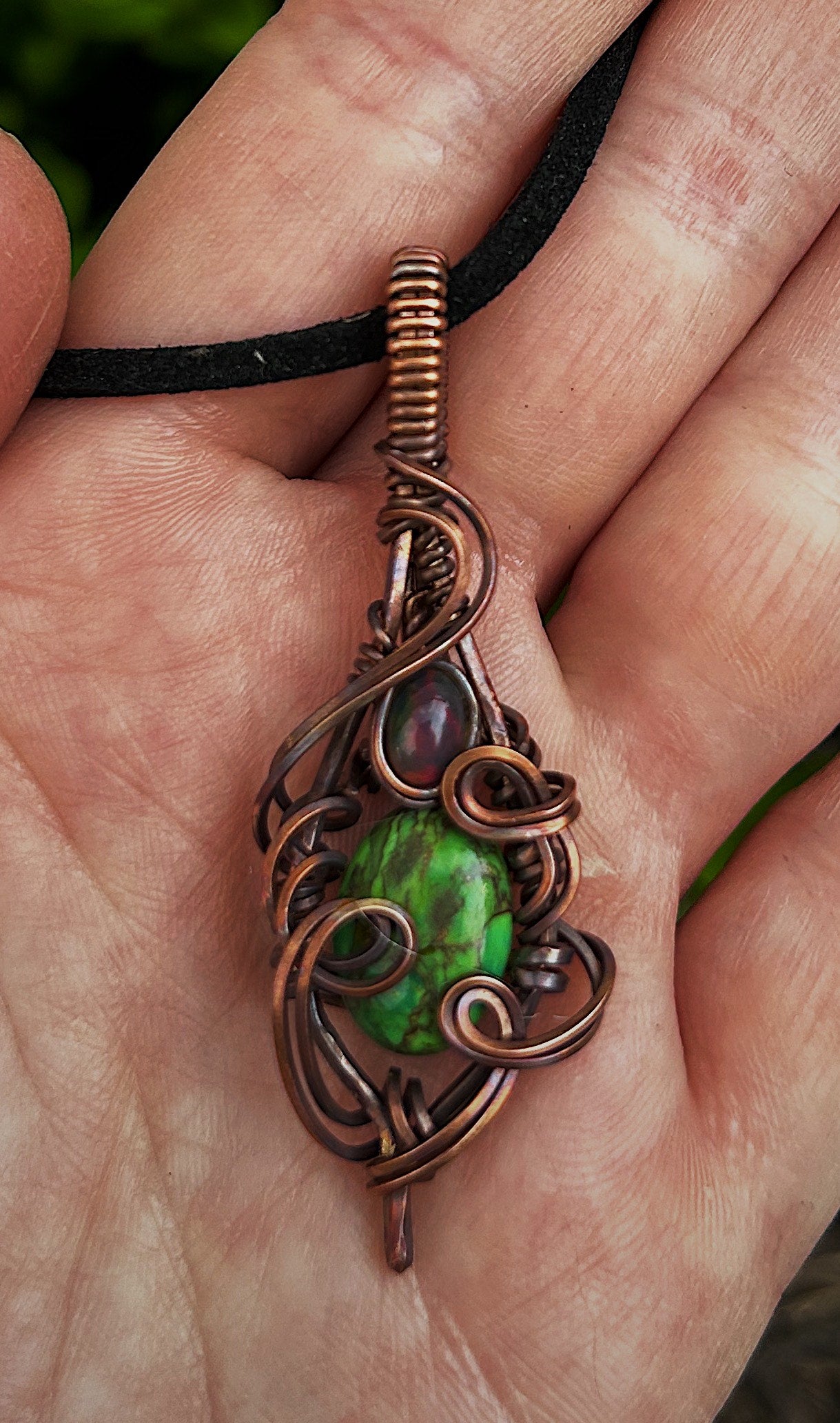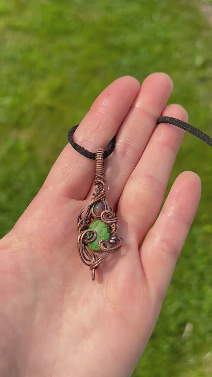 Just because its small doesn't mean its not detailed! Copper wire intricately and delicately wraps around a green copper turquoise stone and beautiful fire opal accent stone.