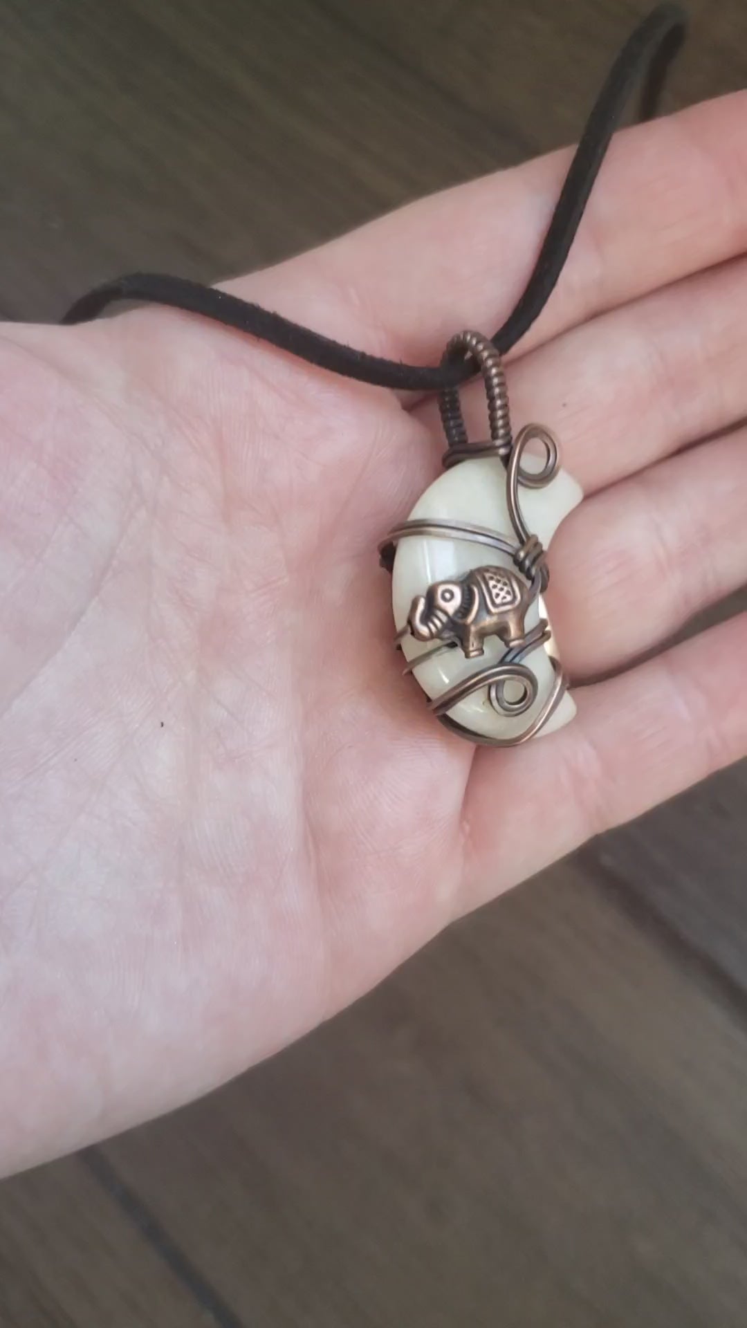 Another cute aventurine stone that is a bit more opaque white. Its wrapped beautifully with oxidized copper. I added a copper elephant bead because the stone reminded me of the white on their tusks.