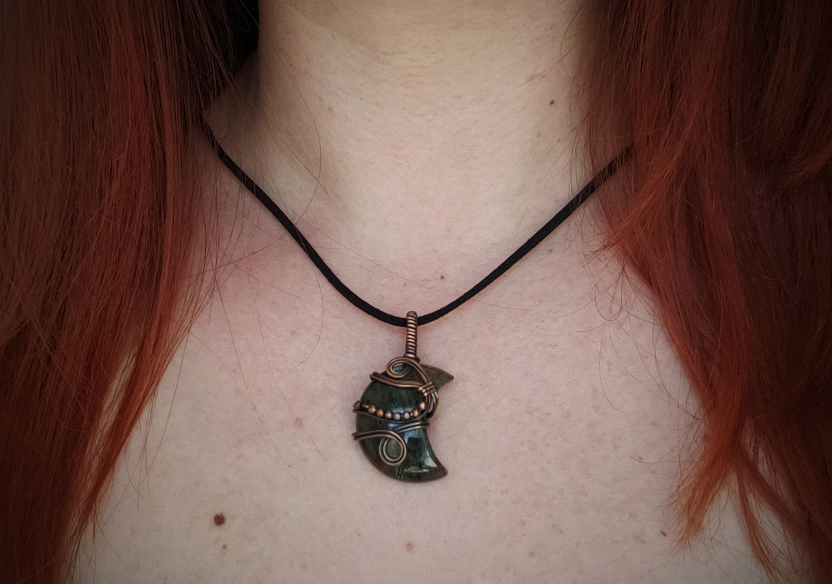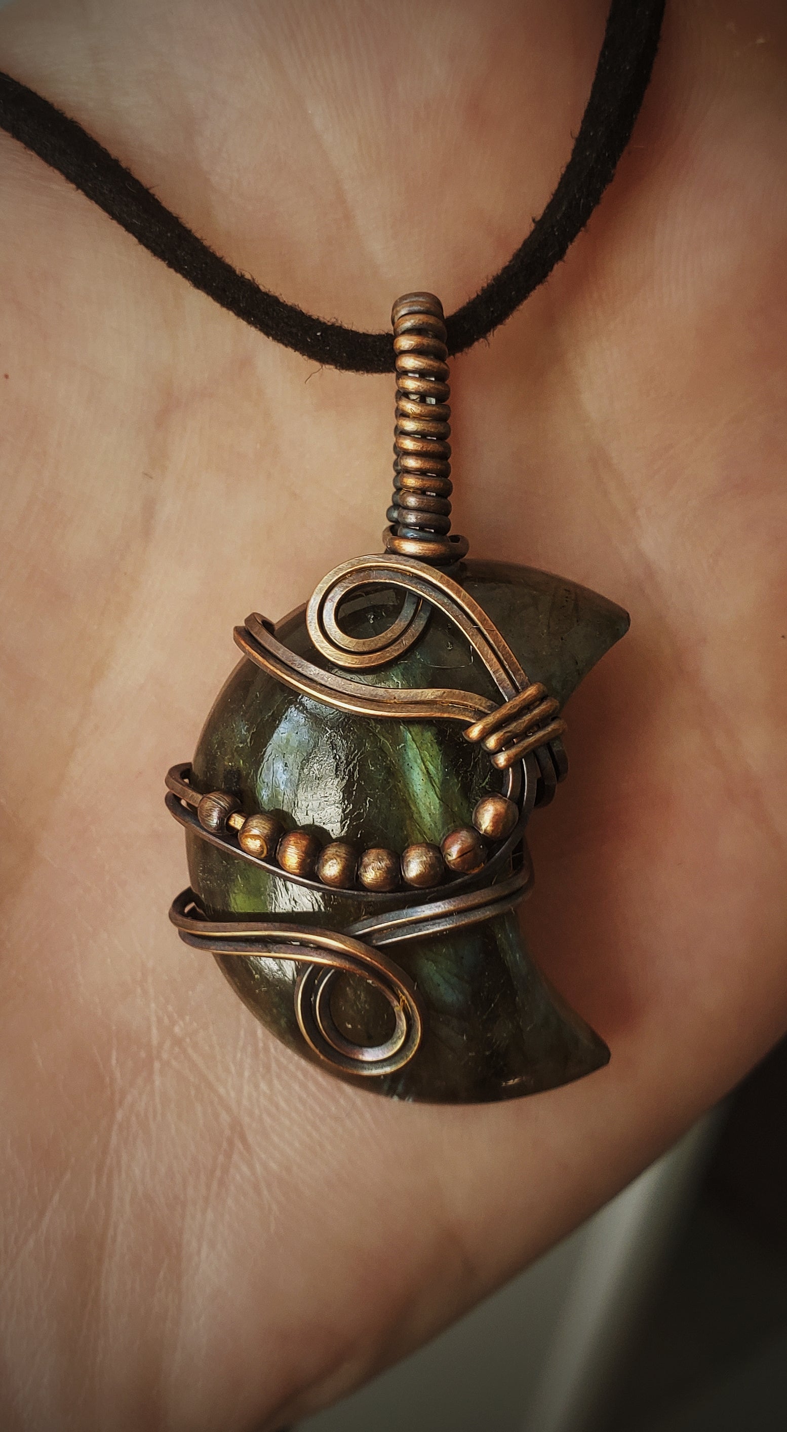 Moon Shaped Labradorite Stone Wrapped in Oxidized Copper and Copper Bead Accents