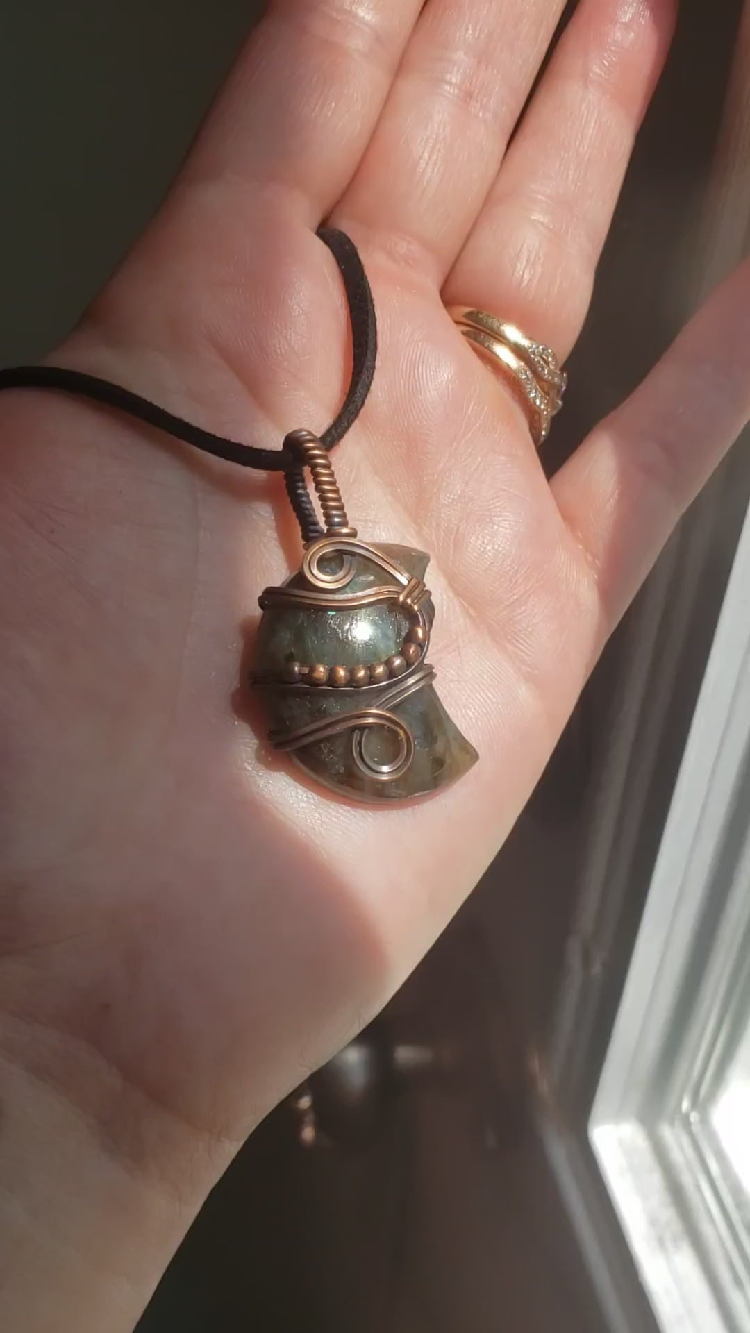 This beautiful moon shaped labradorite has an almost stripe pattern to its flash. Its wrapped in oxidized copper wire and accented with copper beads to add that extra design element.
