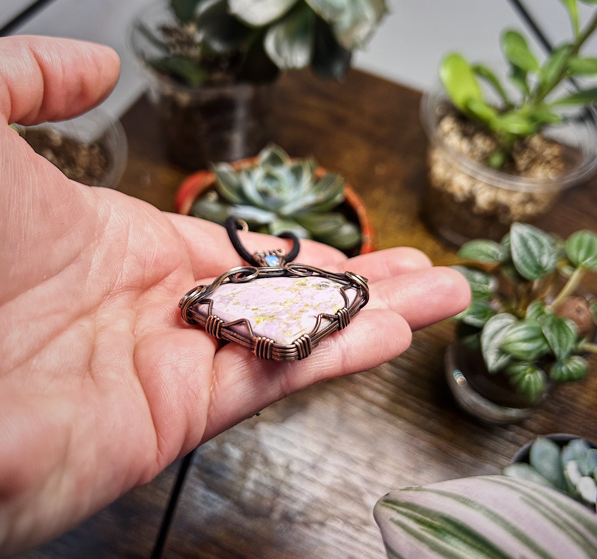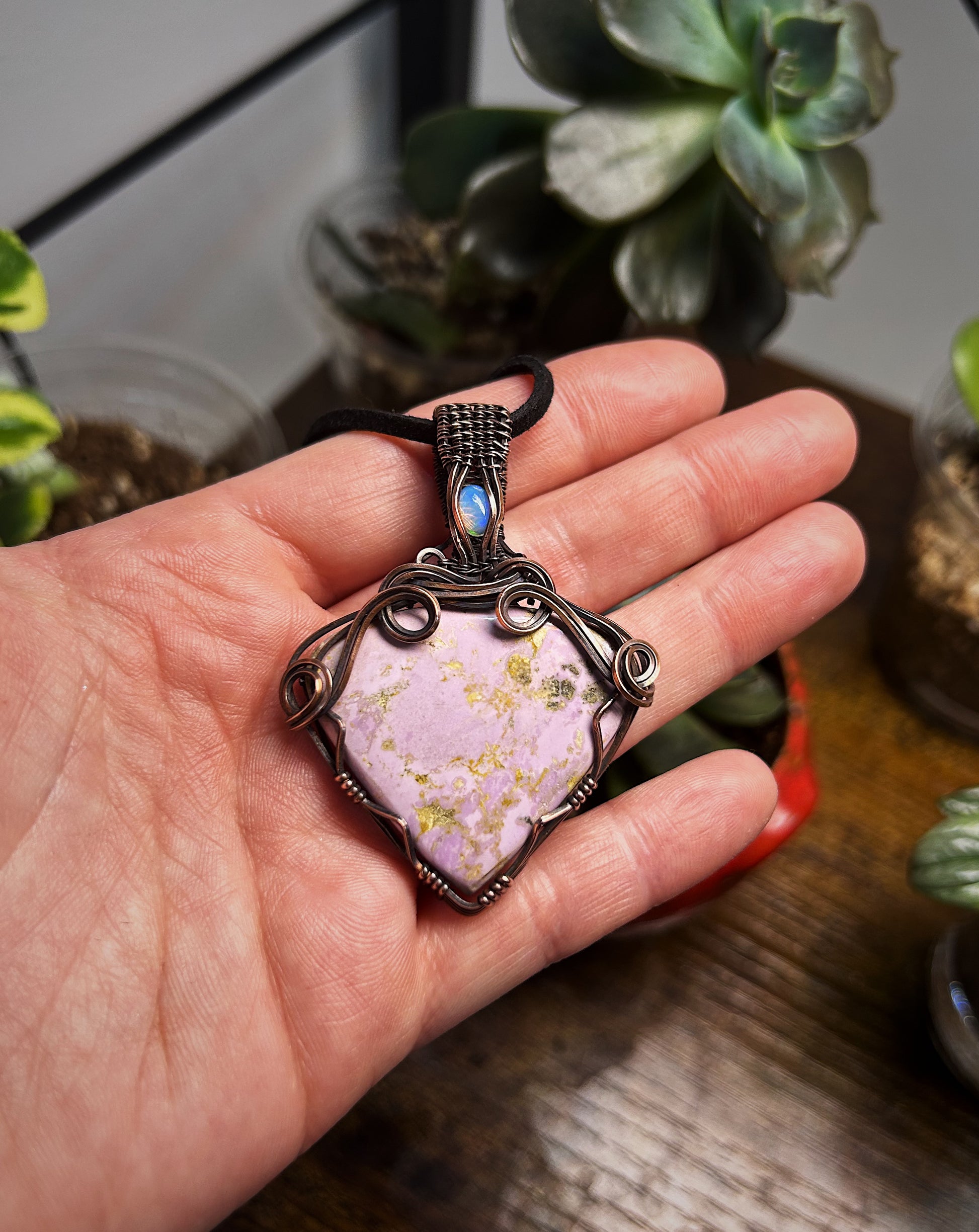 Phosphosiderite stone wrapped in antiqued copper and accented with opal