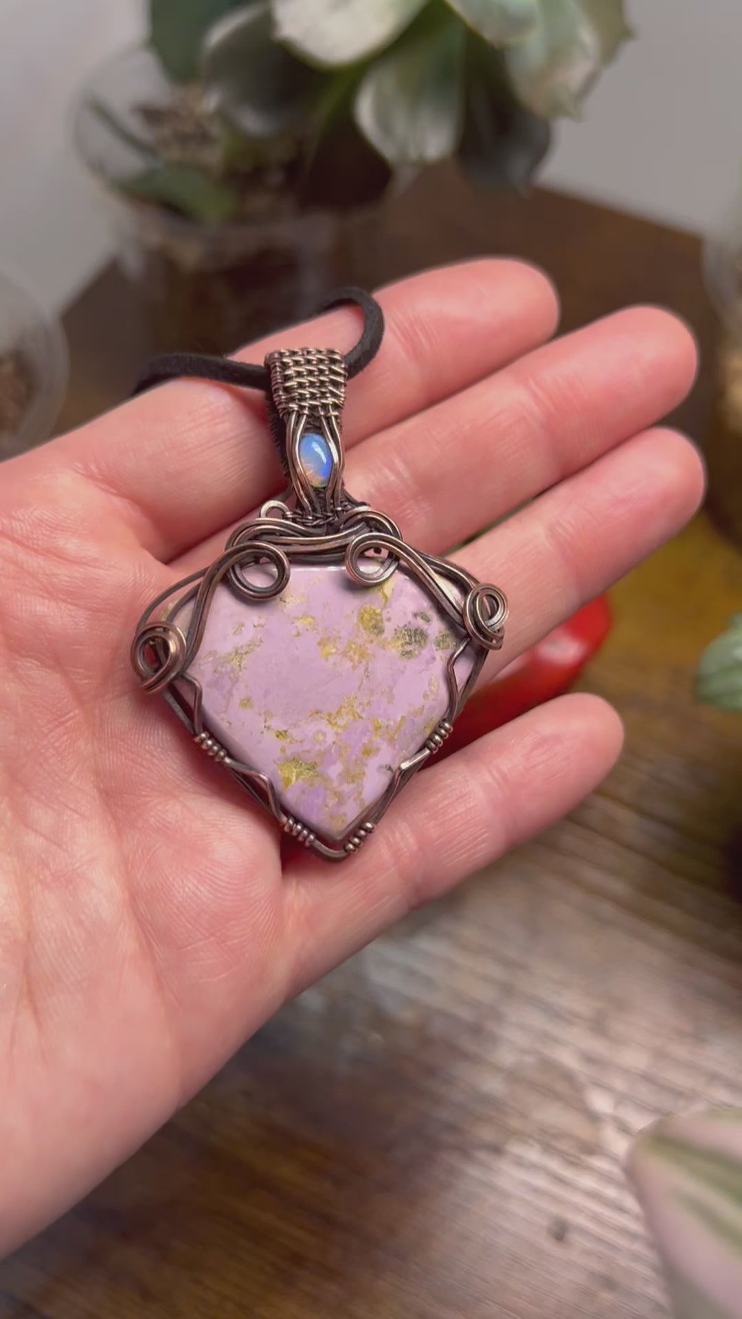 💜This regal looking Phosphosiderite Stone is wrapped in antiqued copper and accented with real opal in bale.