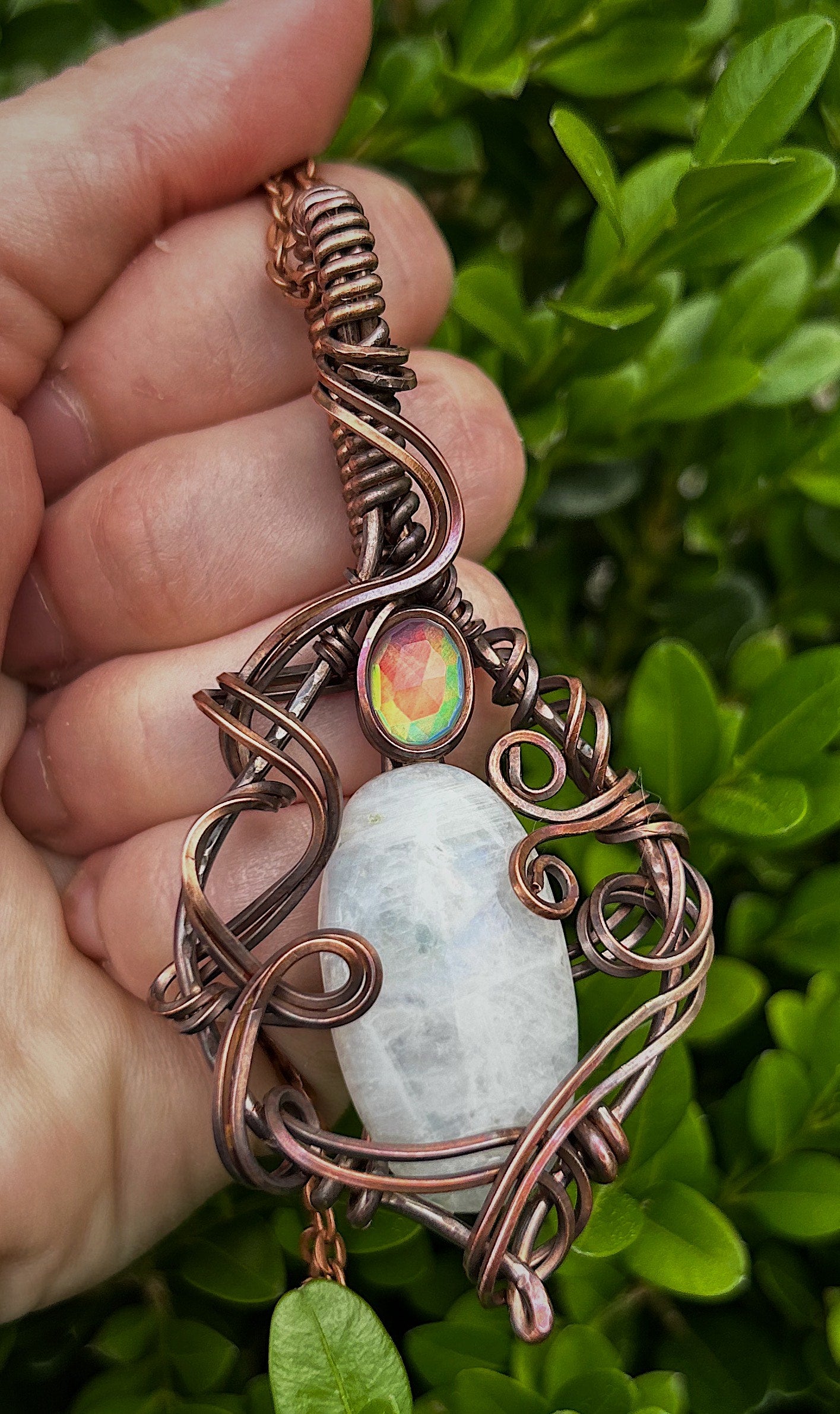 Rainbow Moonstone and Aurora Opal Copper Wire Pendant