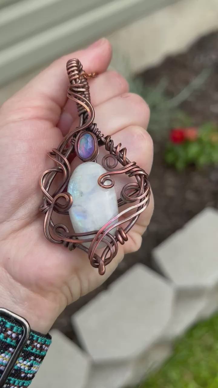 Rainbow Moonstone (natural) Wrapped in Oxidized Copper Wire and Accented with an Aurora Opal (man-made).