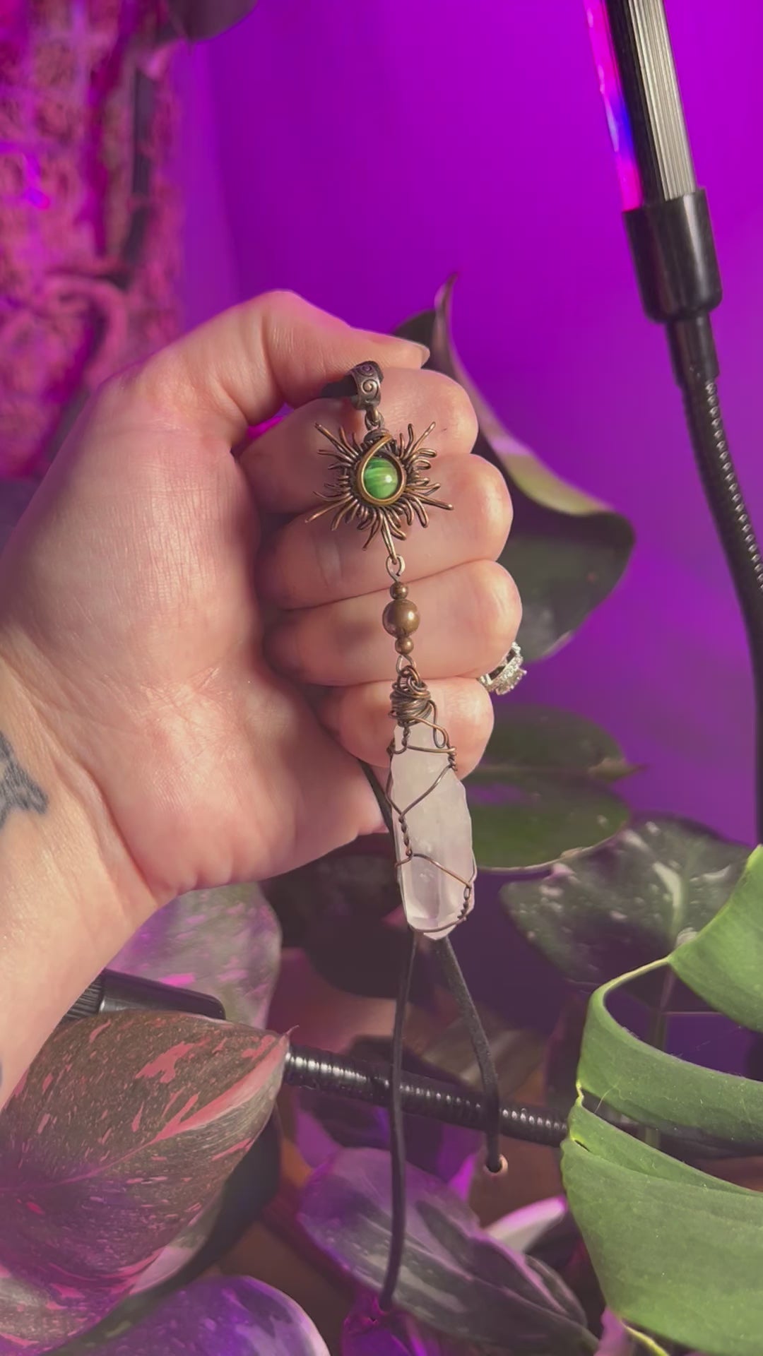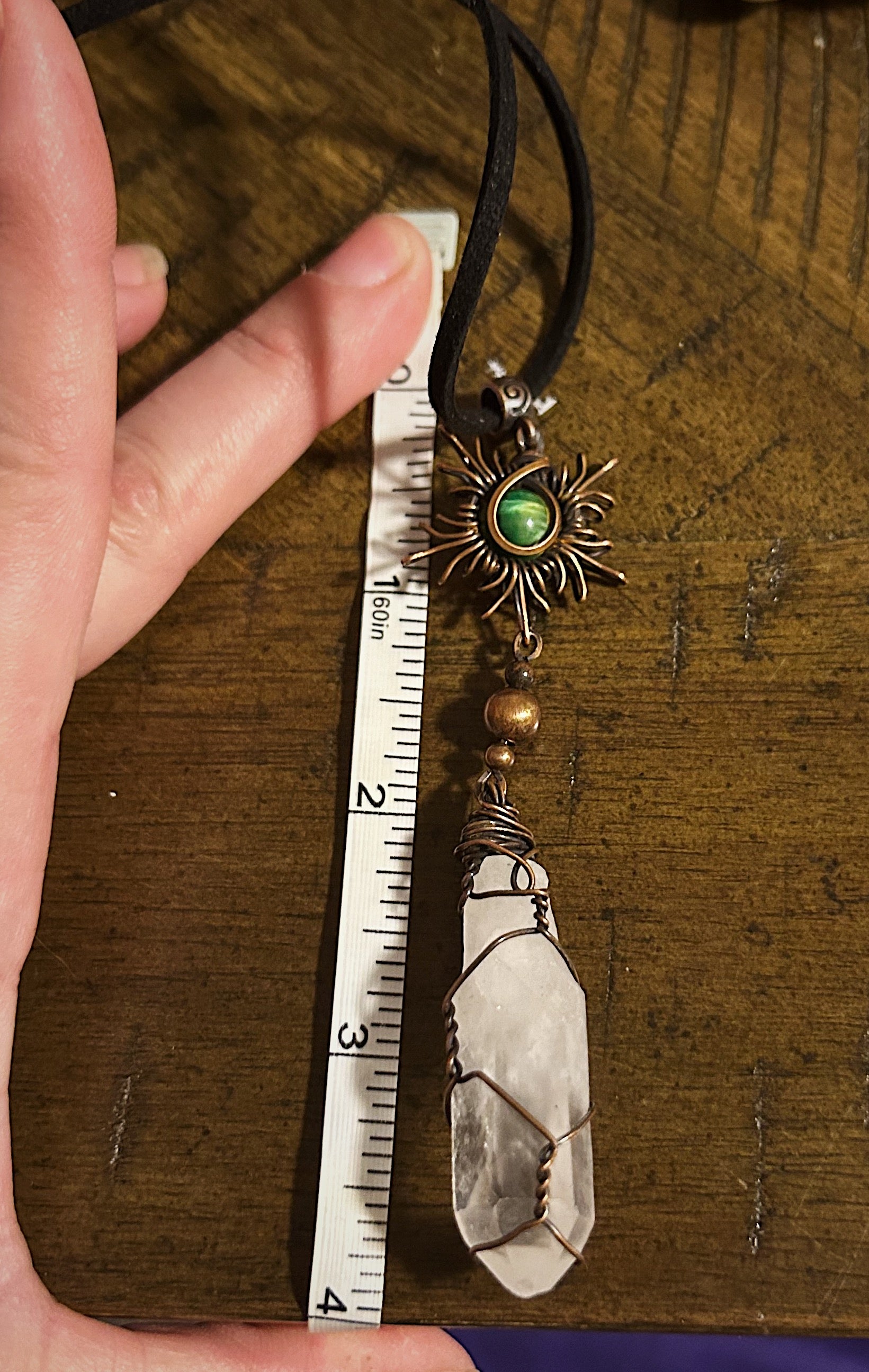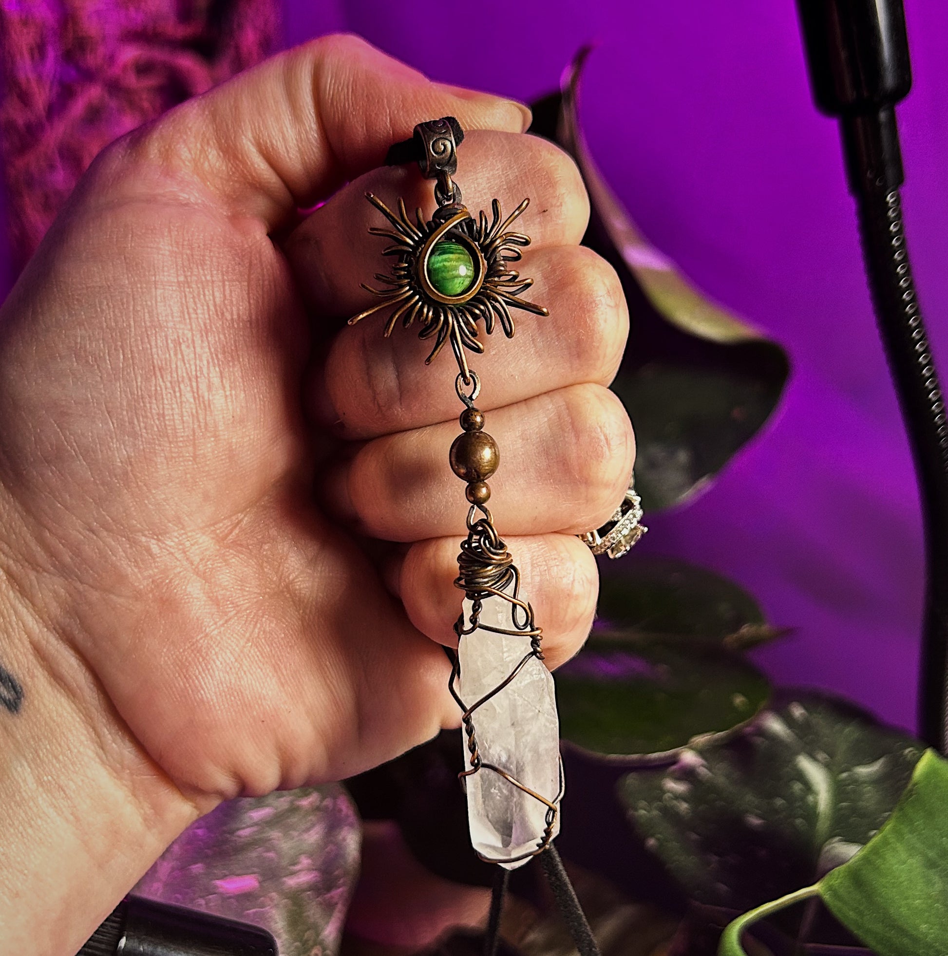 Made with copper wire, quartz crystal and dyed green tigers eye.