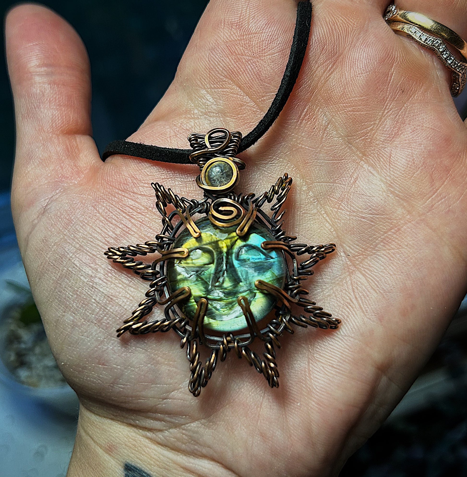 Copper wire wrapped in a sun shape just adorns this cute faced labradorite. Moonstone accent on bake just for fun-skis. ๐