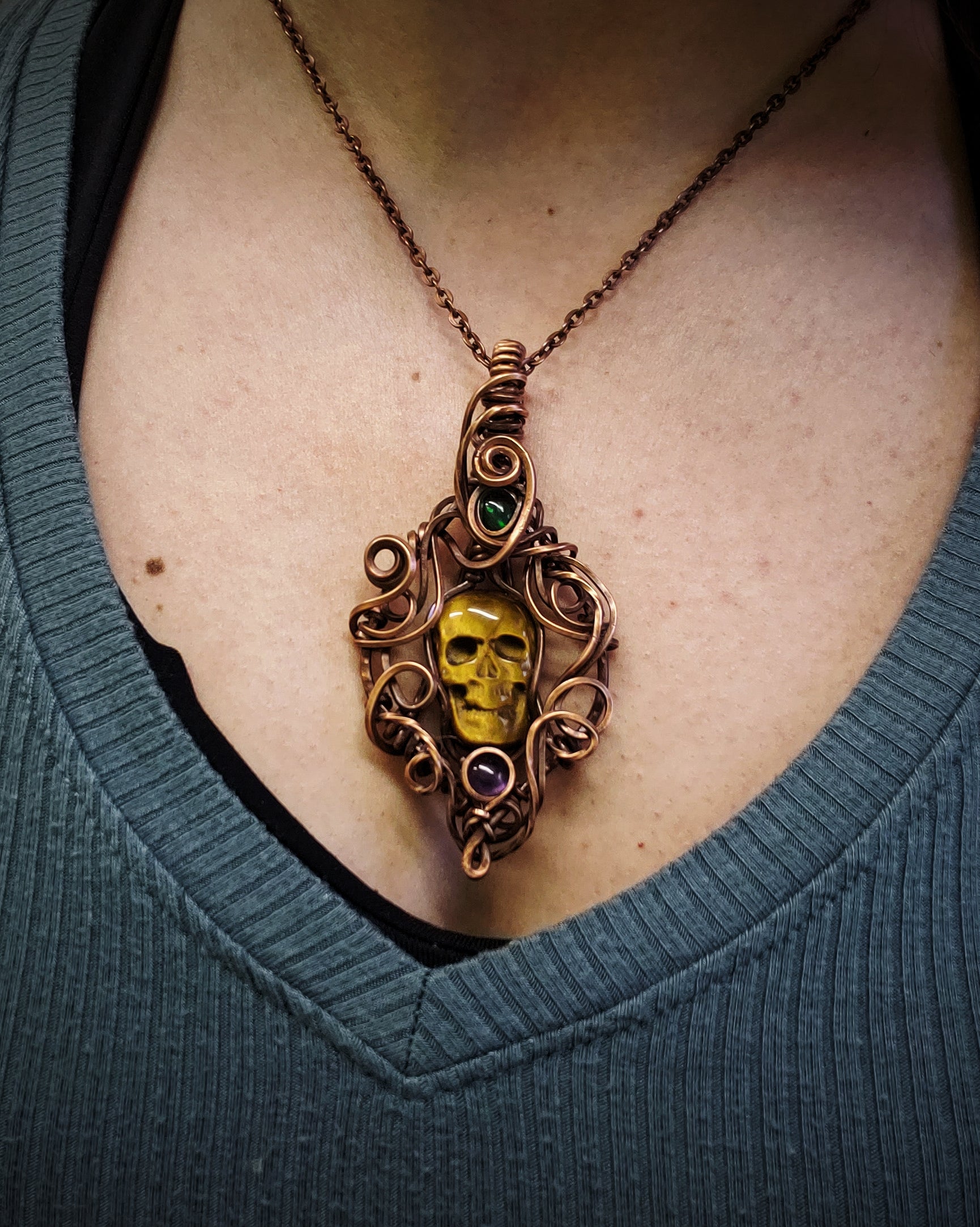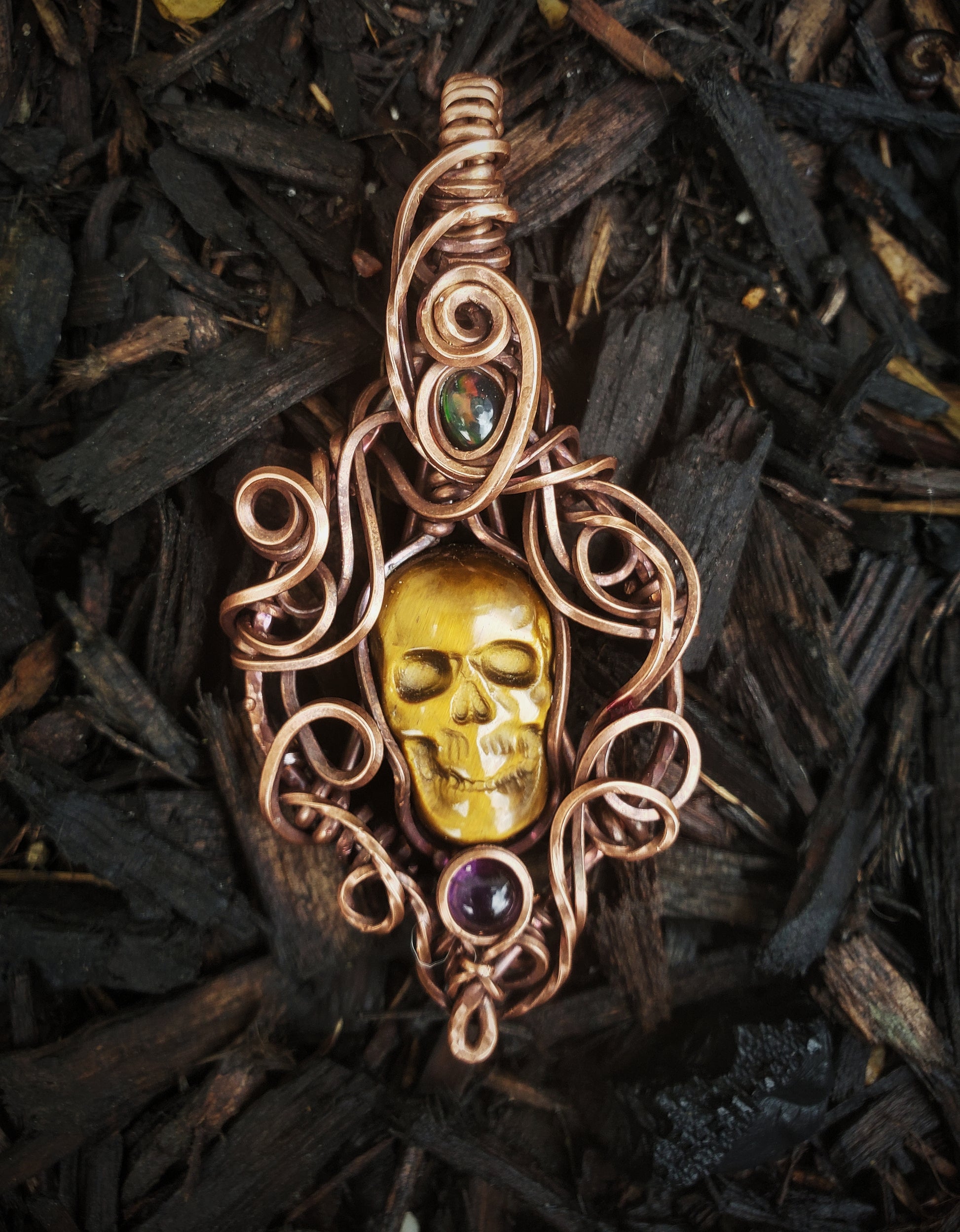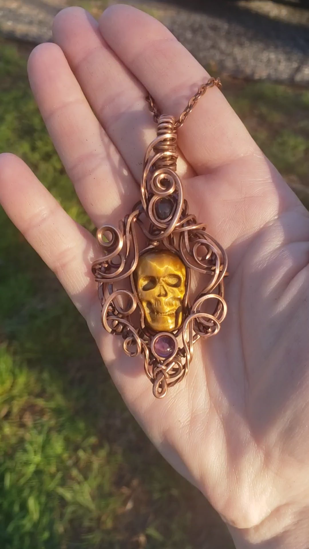 Set in a "chaos style" oxidized copper frame, this tigers eye skull carved stone is center stage. Previously, I had only made simple frames to hold skull stones but I wanted to design an approach to really make these beauties pop. I secured the tigers eye skull then went to town letting the wire frame tell me where it wanted to go. I felt it needed friends too so I decided to add a fire opal stone at the top and an amythest at the bottom.
