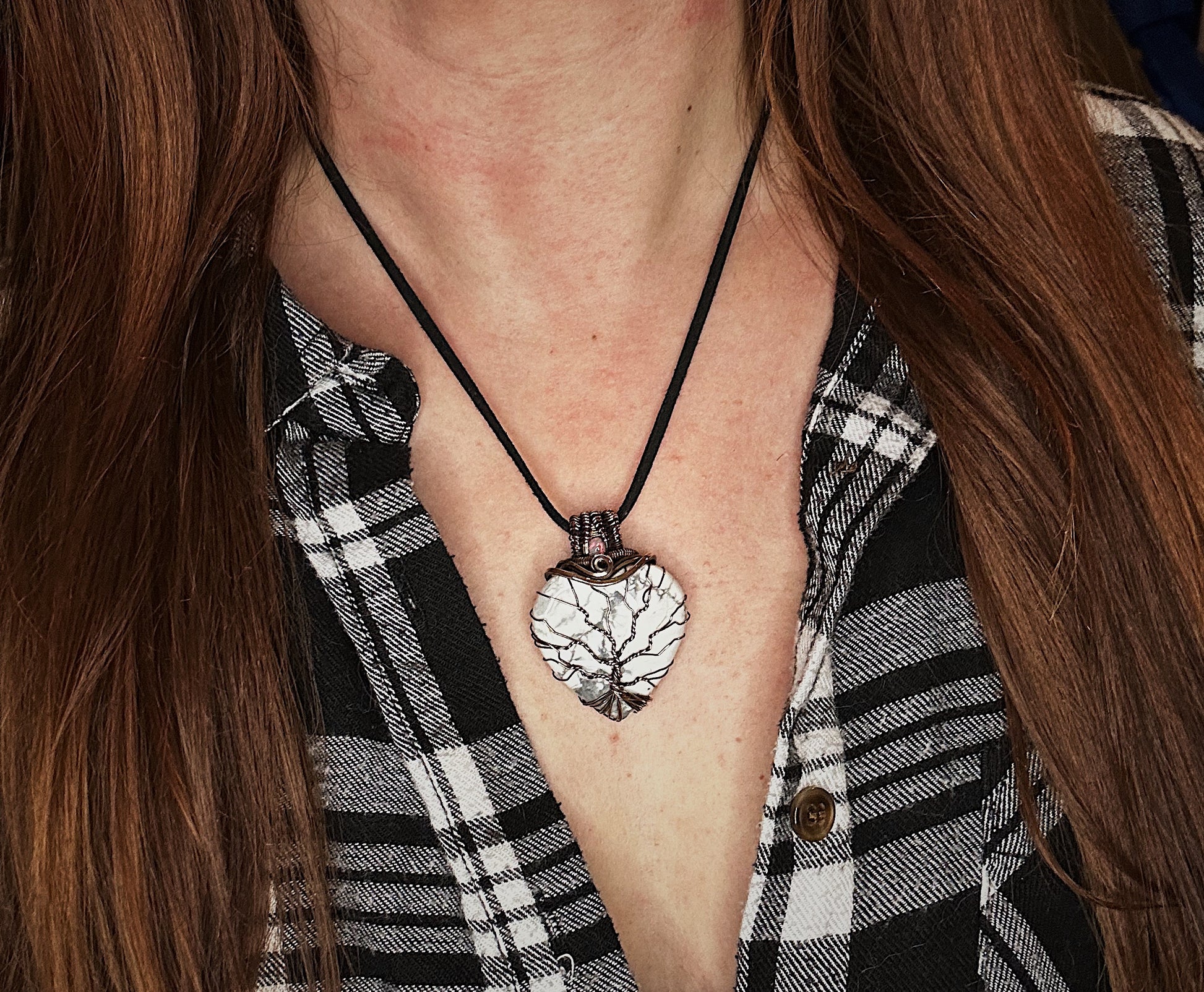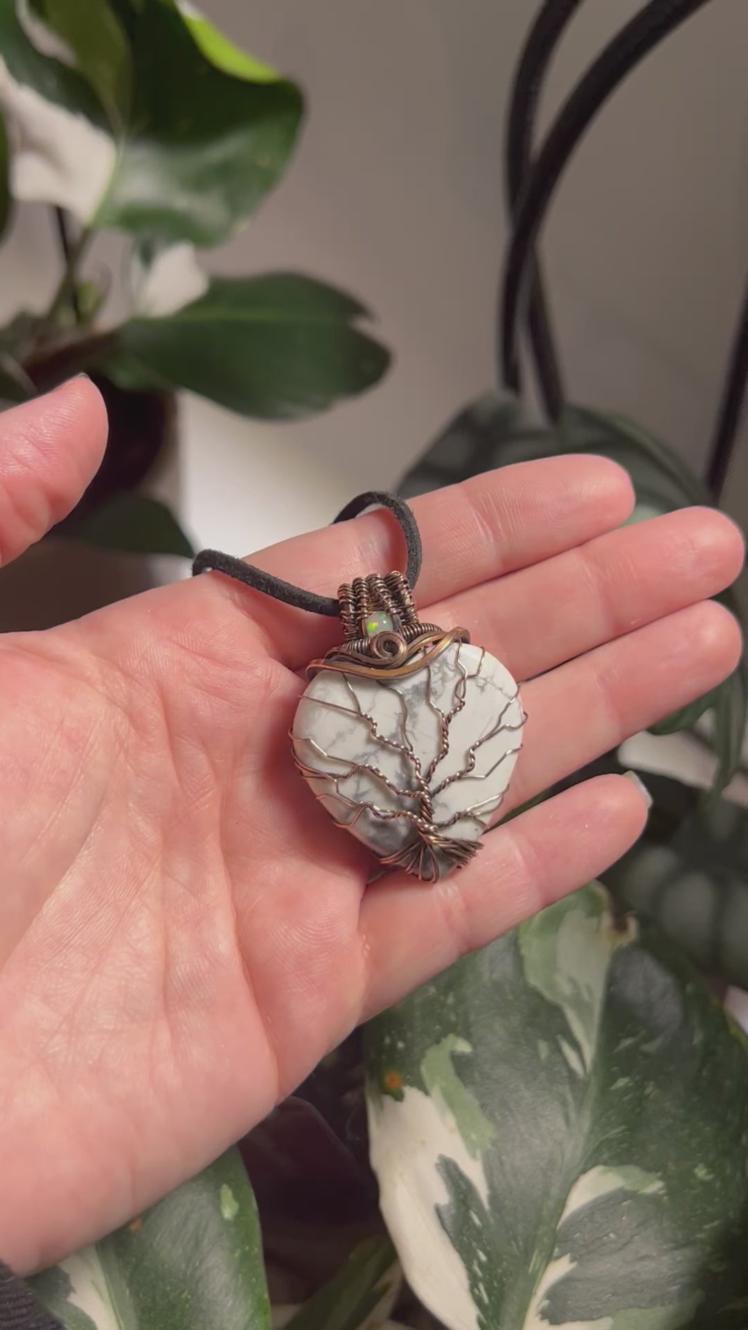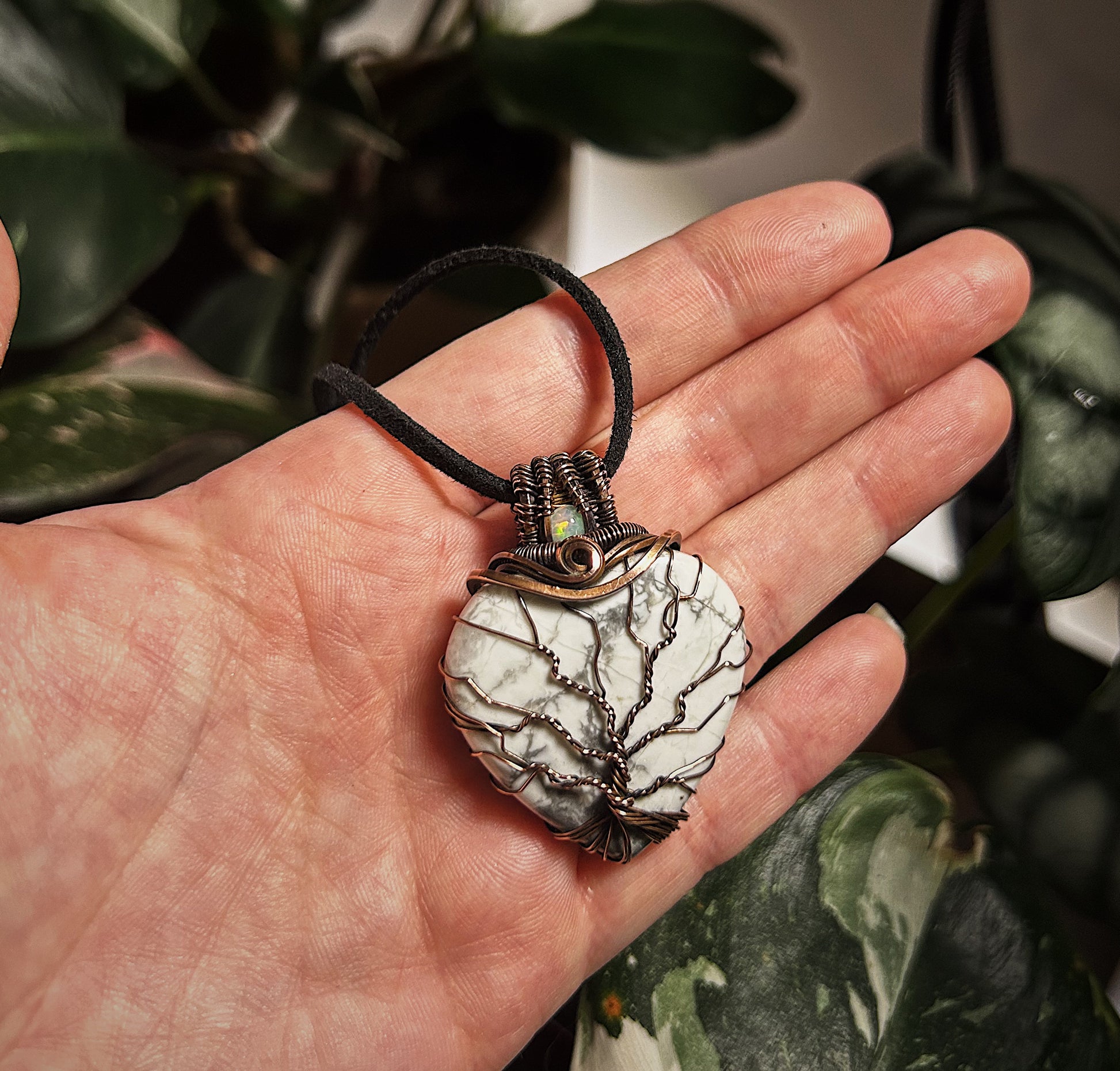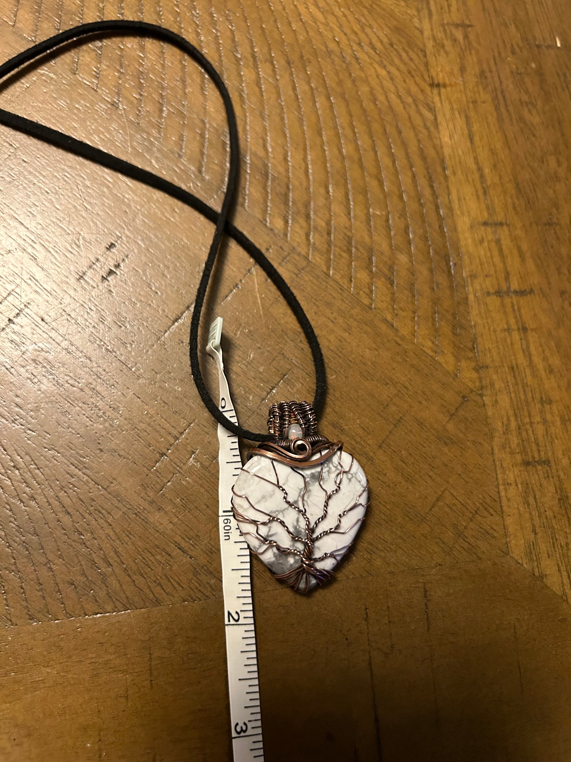 Hand wrapped copper tree of life over heart shaped howlite stone.