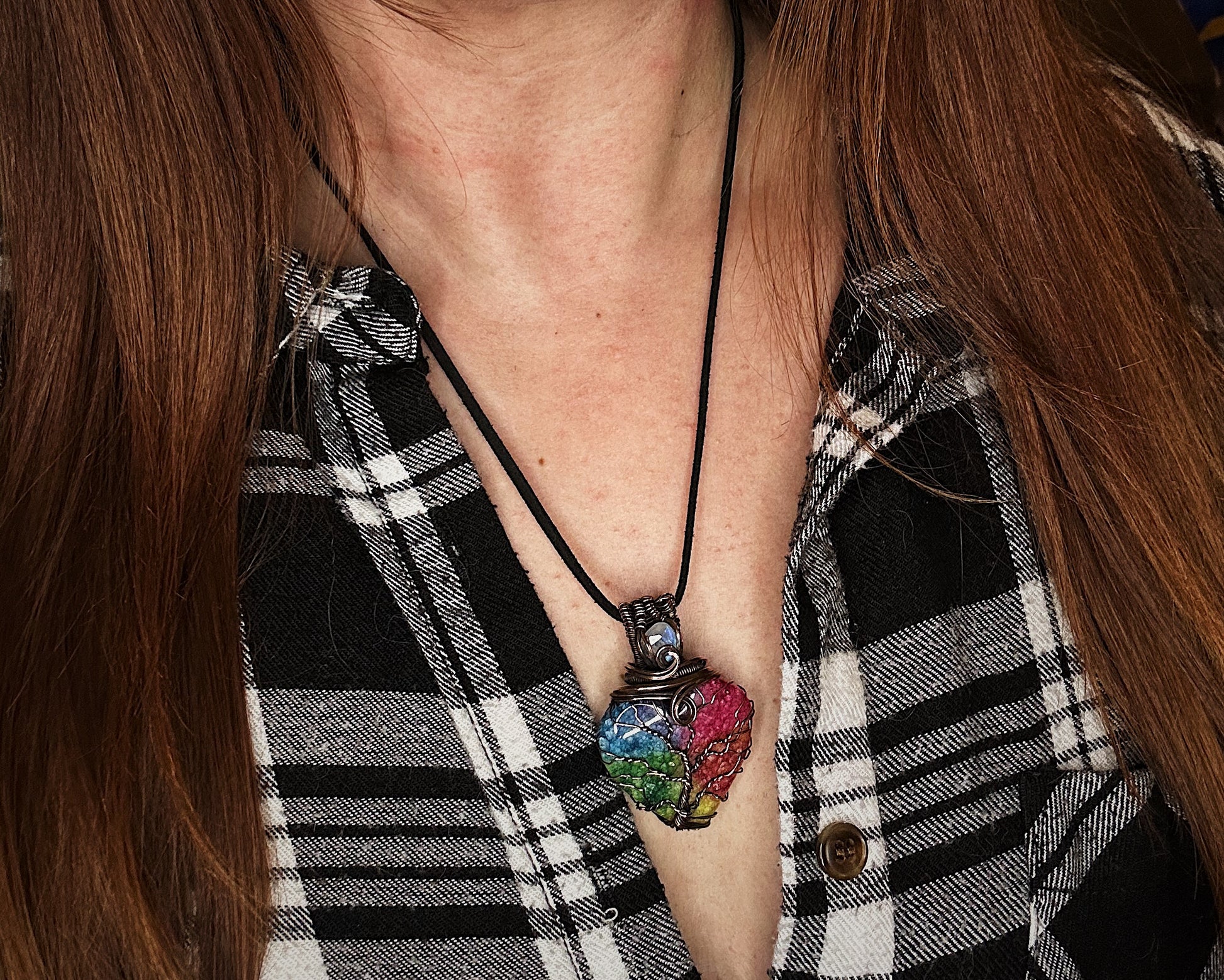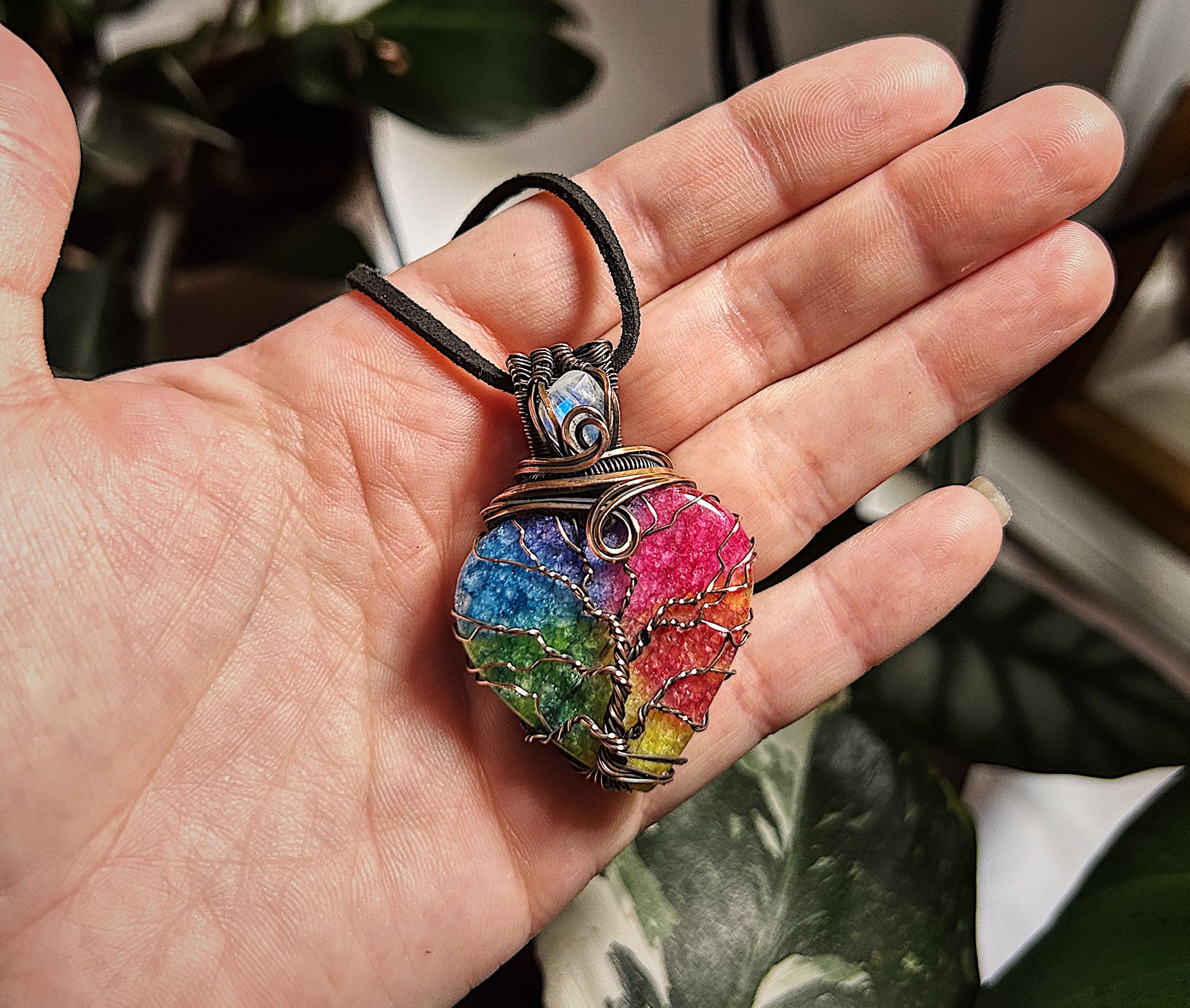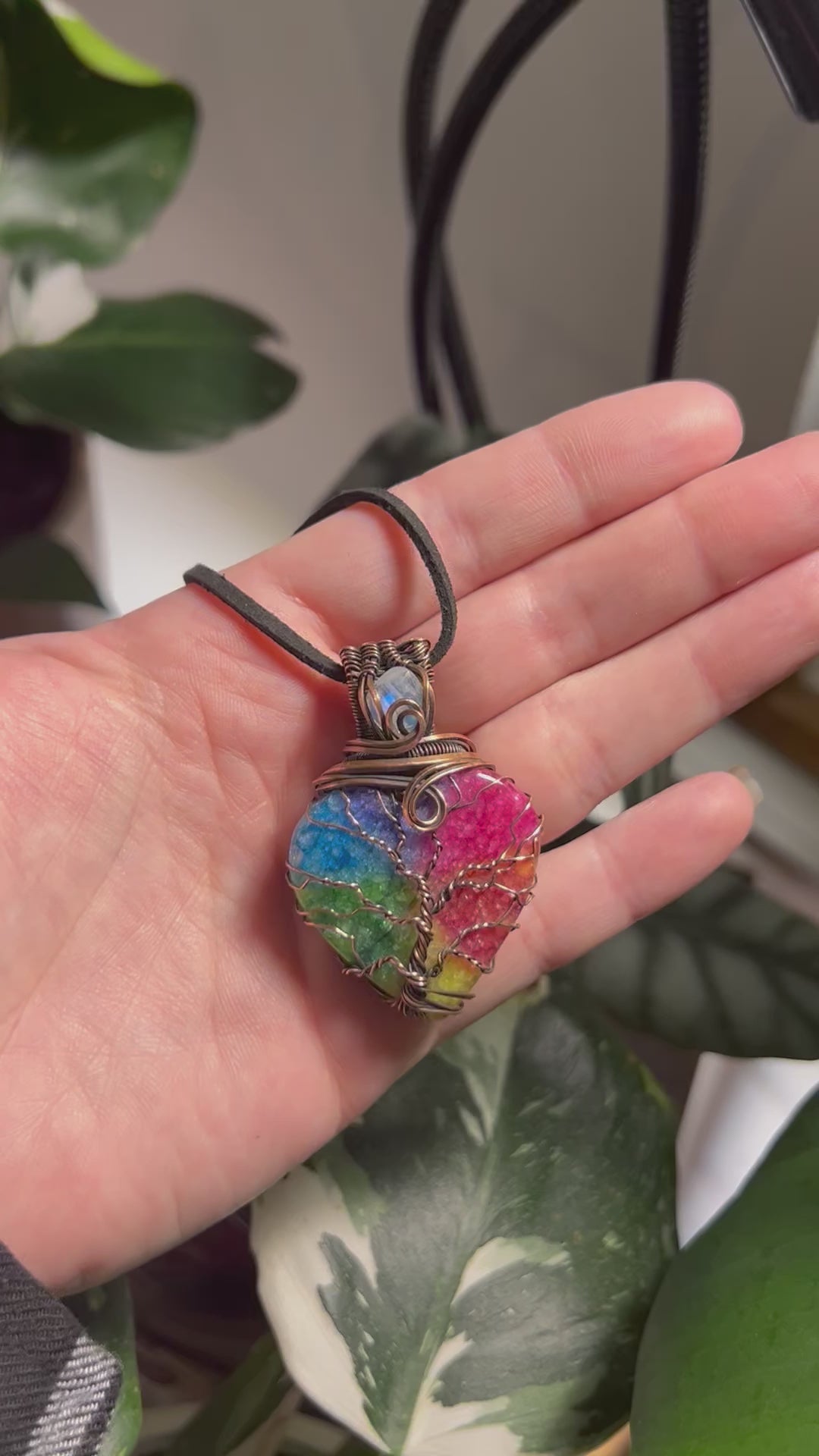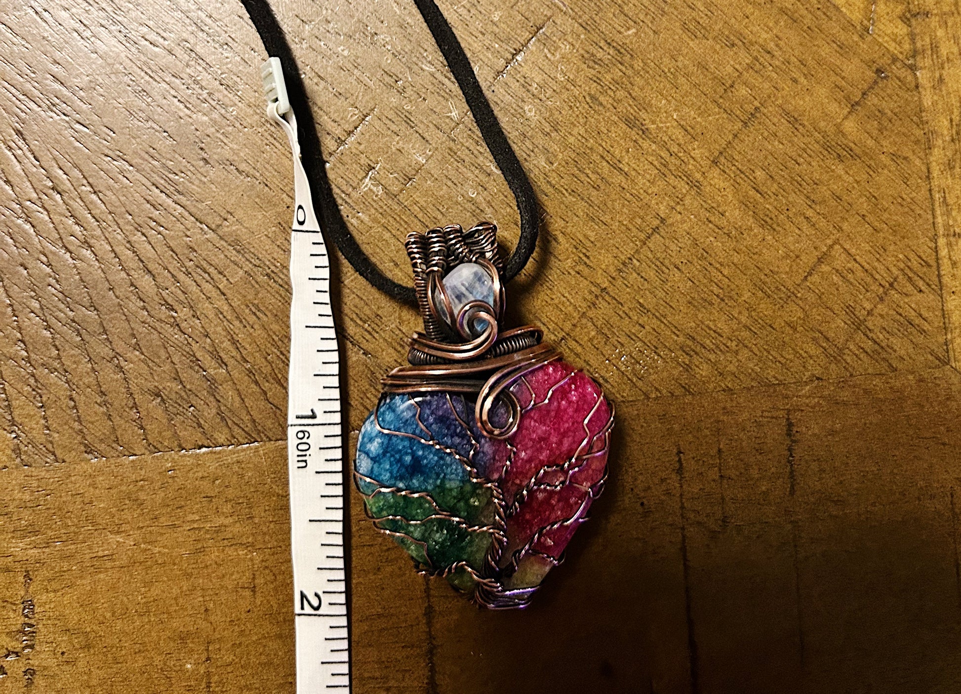 Hand wrapped copper tree of life over heart shaped rainbow druzy stone.
