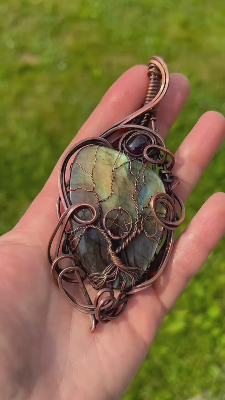 Pendant with Large Labradorite Encased in Oxidized Copper, Pentagram Tree of Life and Amethyst Accent.
